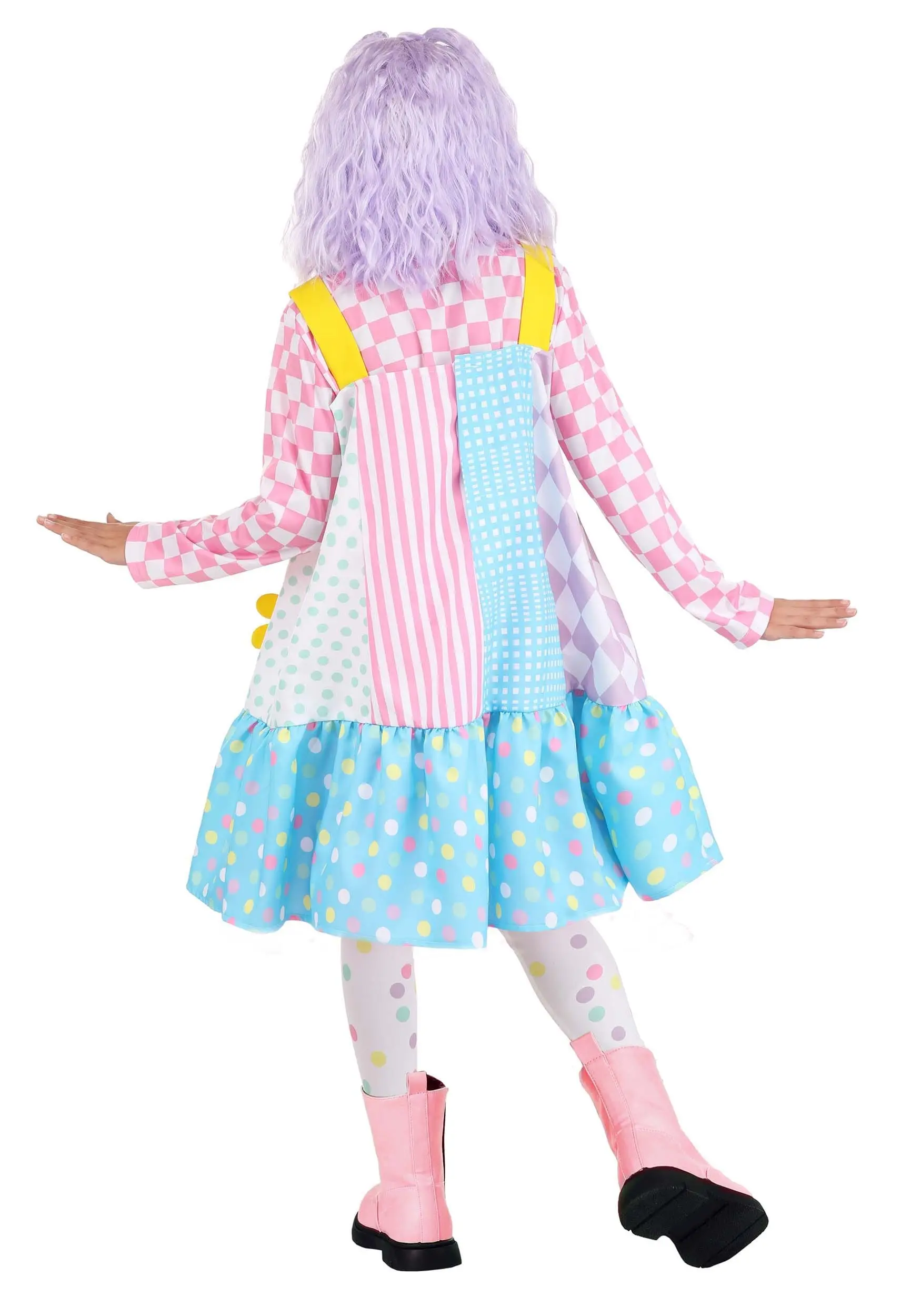 Give clowns a better name when you offer up this exclusive Pinafore Clown Costume to a kiddo! This is a Made By Us design that starts with a pink and white checkered shirt and a pair of pastel polka dot tights. Worn over top is a pinafore dress. The uncinched style, faux flowers, combination of multiple patterned panels, and the large buttons on the shoulder straps create a whimsical look that anyone is sure to love. Add a bright clown wig or pastel face paint to this outfit to complete a truly joyful time while your kid clowns around!