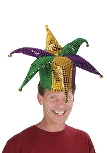 Celebrate Mardi Gras and beyond in this Glitz ‘N Gleam Jester Hat for Adults! The stand-up hat is made of soft, sequined material in shiny shades of purple, green and gold. Six pointed tips dangle from the crown, each finished with a tiny gold-tone bell. You’ll be able to draw everyone’s attention to your act simply by walking into the room!Â