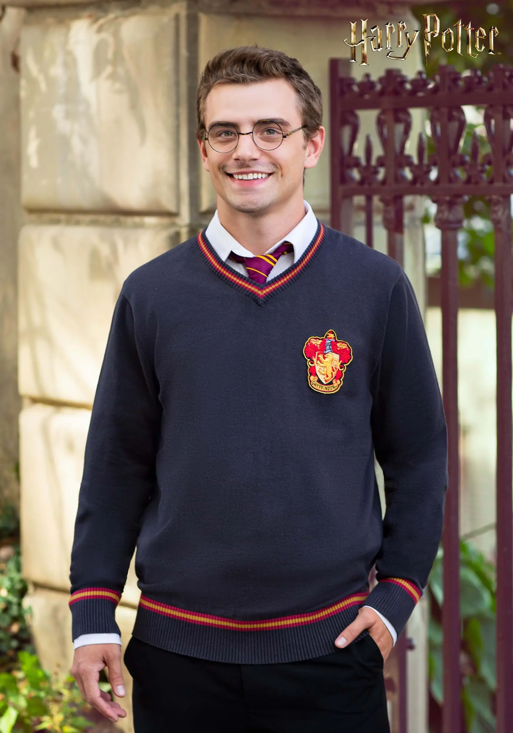 This Harry Potter uniform sweater is officially licensed. The high quality is noticeable at first sight with the Gryfindor colors woven into the ribs on the cuffs and V-neck. A bold Gryffindor shield announces your house to anyone you see. The comfortable fit pairs perfectly with a collared shirt and tie as well as a Gryffindor robe. Transcending your costume collection, this sweater will look right at home with your everyday outfits. You might not spend your time wandering the halls of Hogwarts but you certainly deserve a little magic in your wardrobe!Â