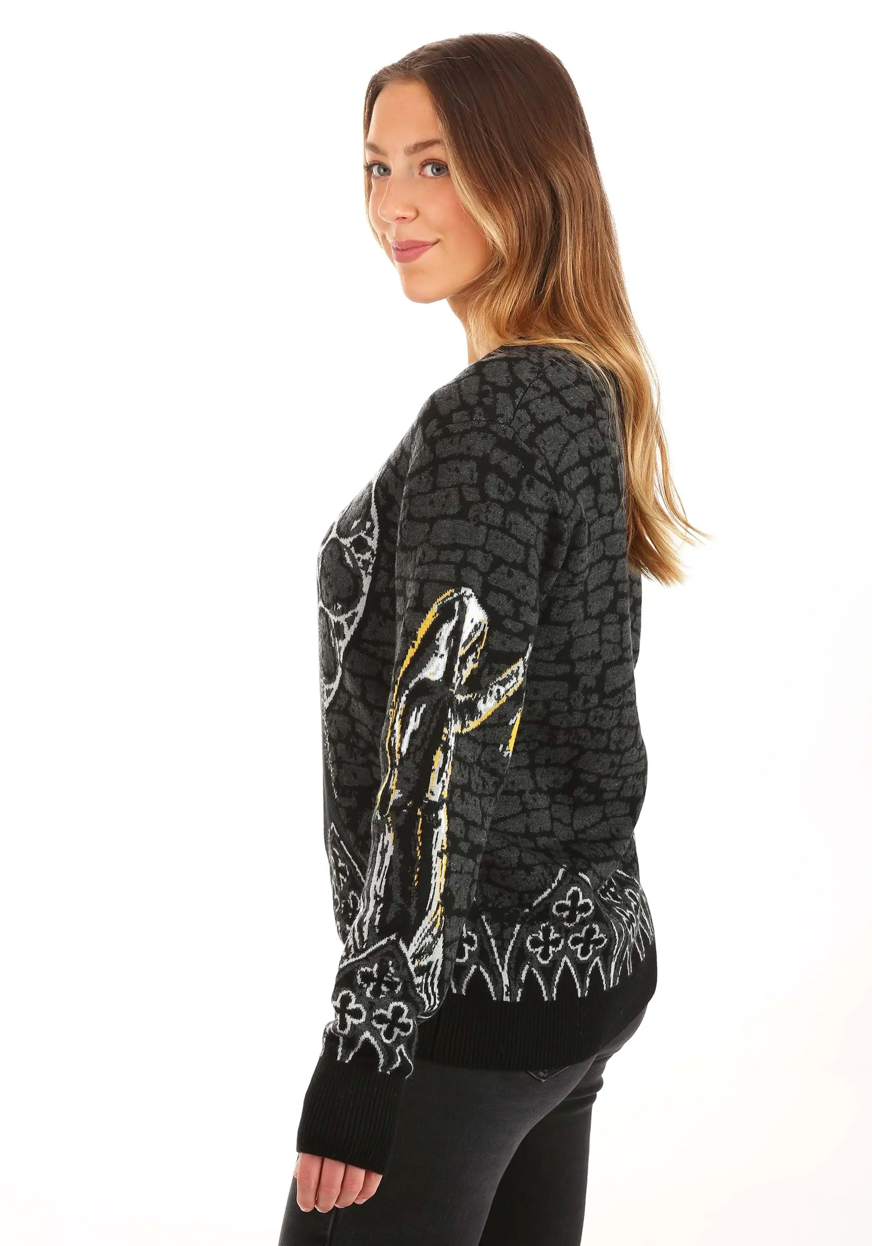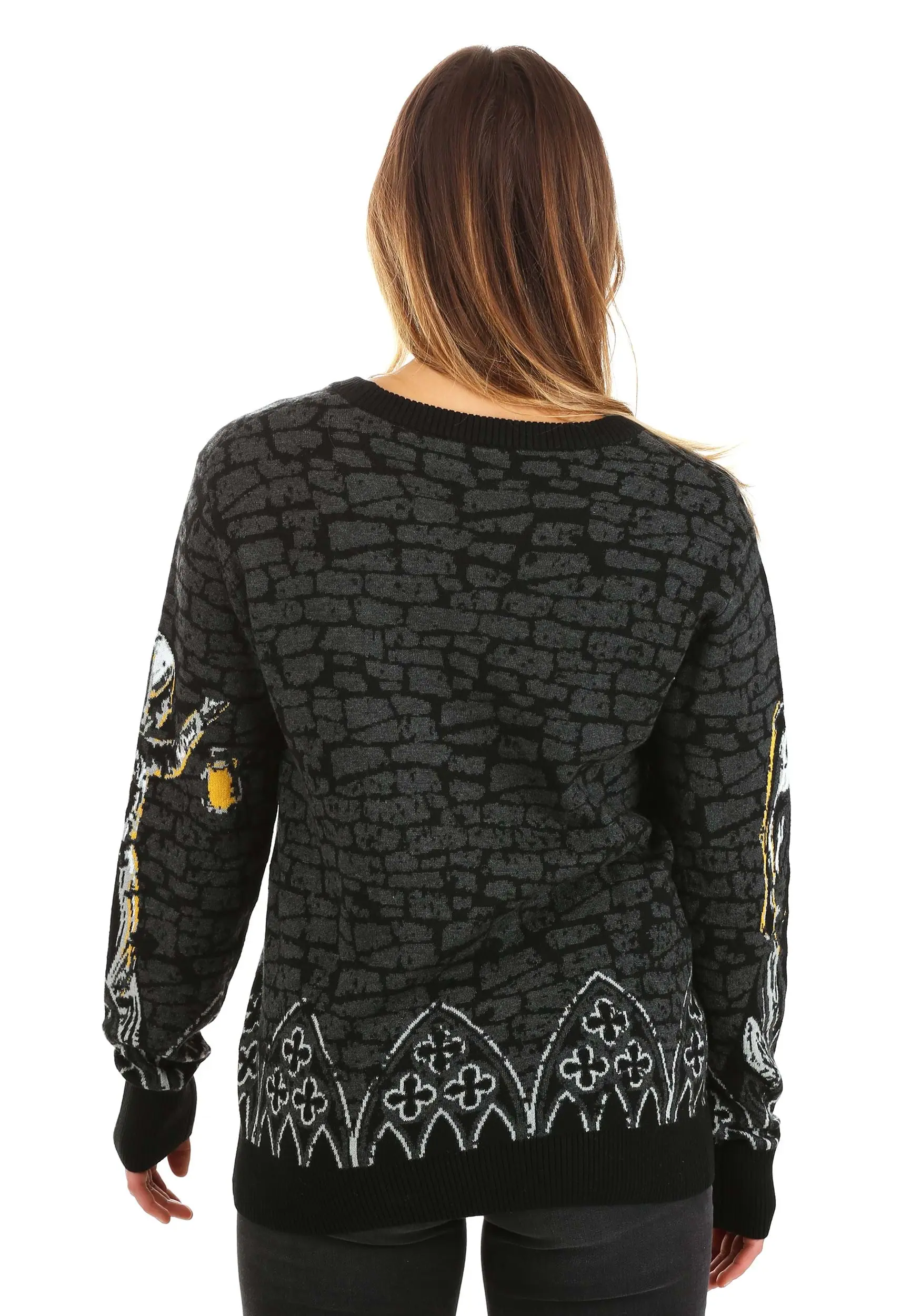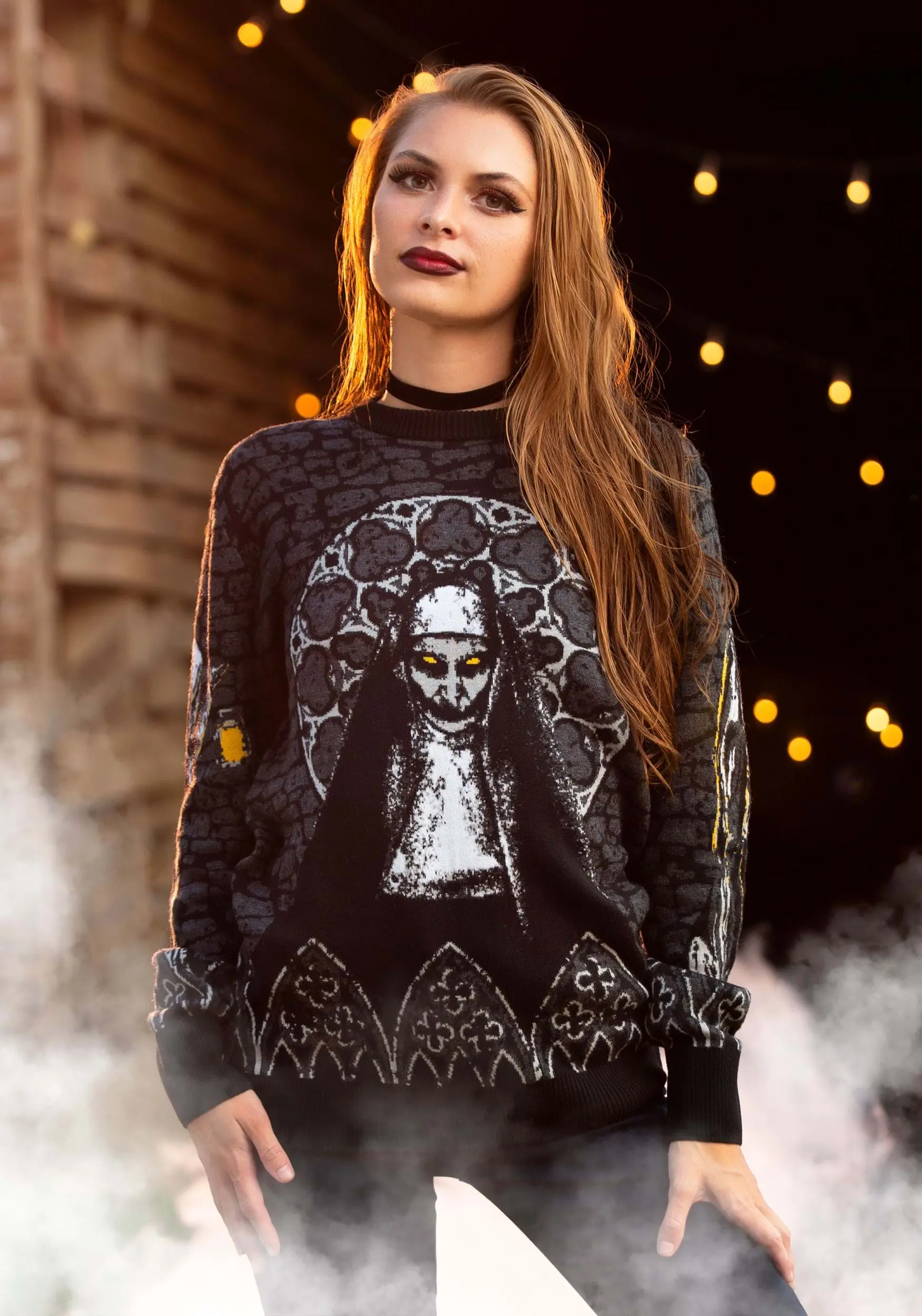 Keep those evil forces under control by binding them in creepy couture instead! Our Made By Us design warlocks have woven together the perfect prison for Valak in the form of this Adult The Nun Halloween Sweater. Comfy and cozy despite its wicked appearance, this sweater features the ne’er-do-well Nun surrounded by the gothic details of a haunted church. It’s perfect for any fan of The Conjuring universe or for those who just want to have a comfy sweater that’ll send chills down anyone’s spine.