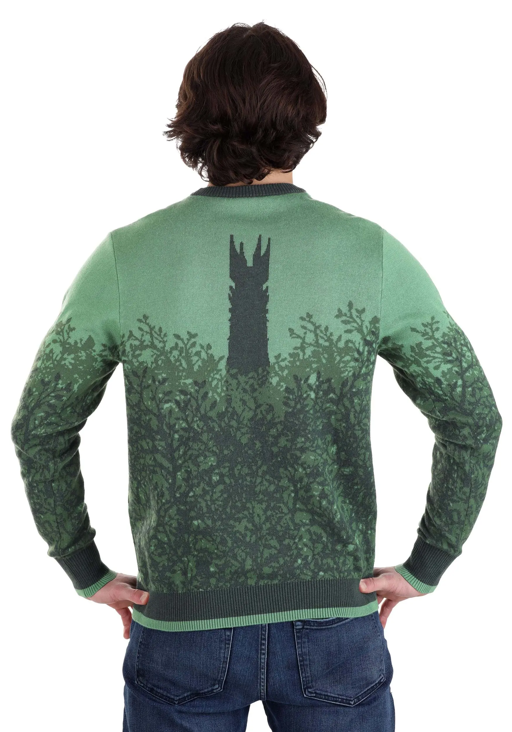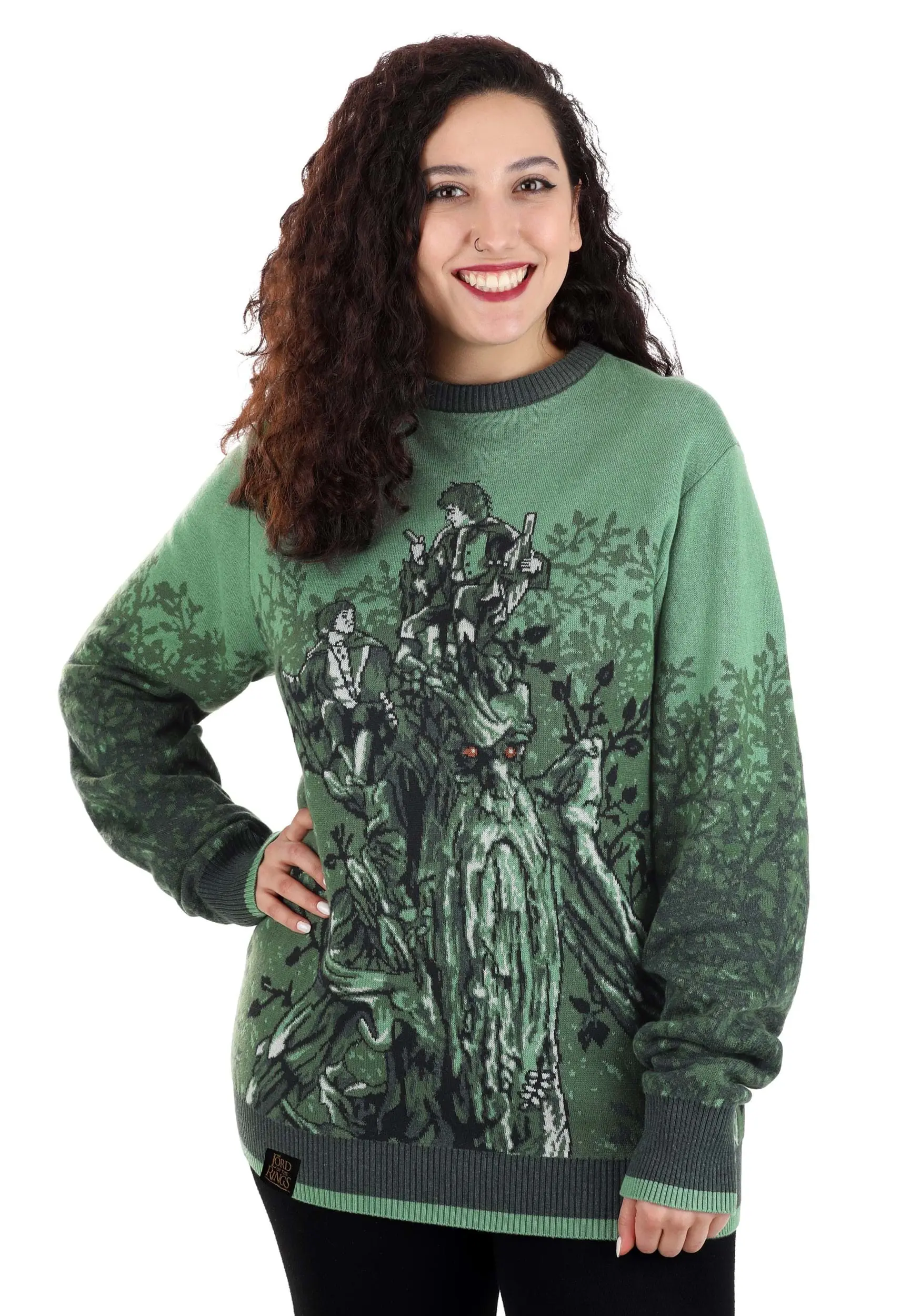 The Made By Us knit sweater features a nearly all-green color palette that’s thoughtfully layered to illustrate the great Fangorn Forest and Treebeard carrying Merry and Pippin. The pullover has a rib-knit hem, collar, and cuffs that create a relaxed but cozy fit. A tag along the hem labels the sweater officially licensed. Meanwhile, the sweater’s inclusive sizing ensures various styles and fits for any fan!