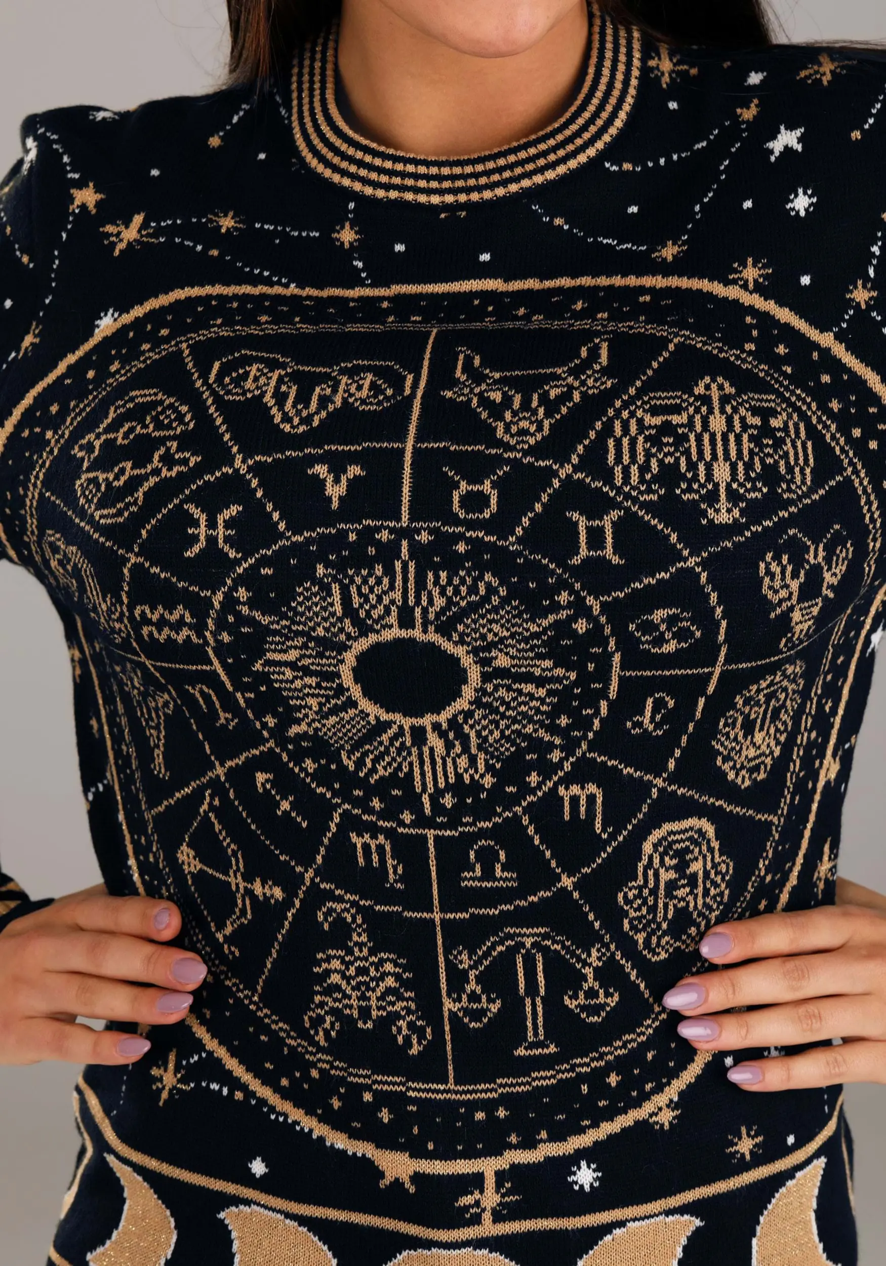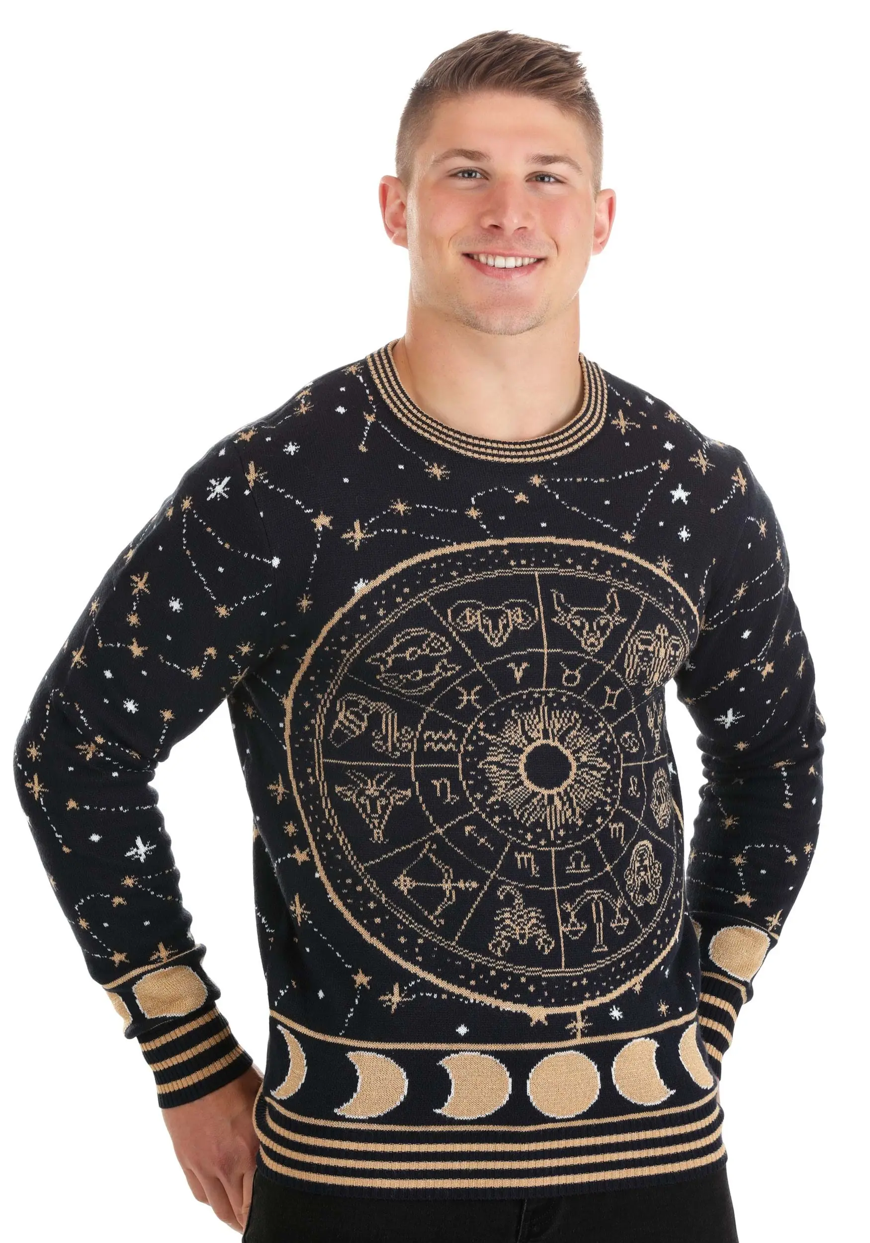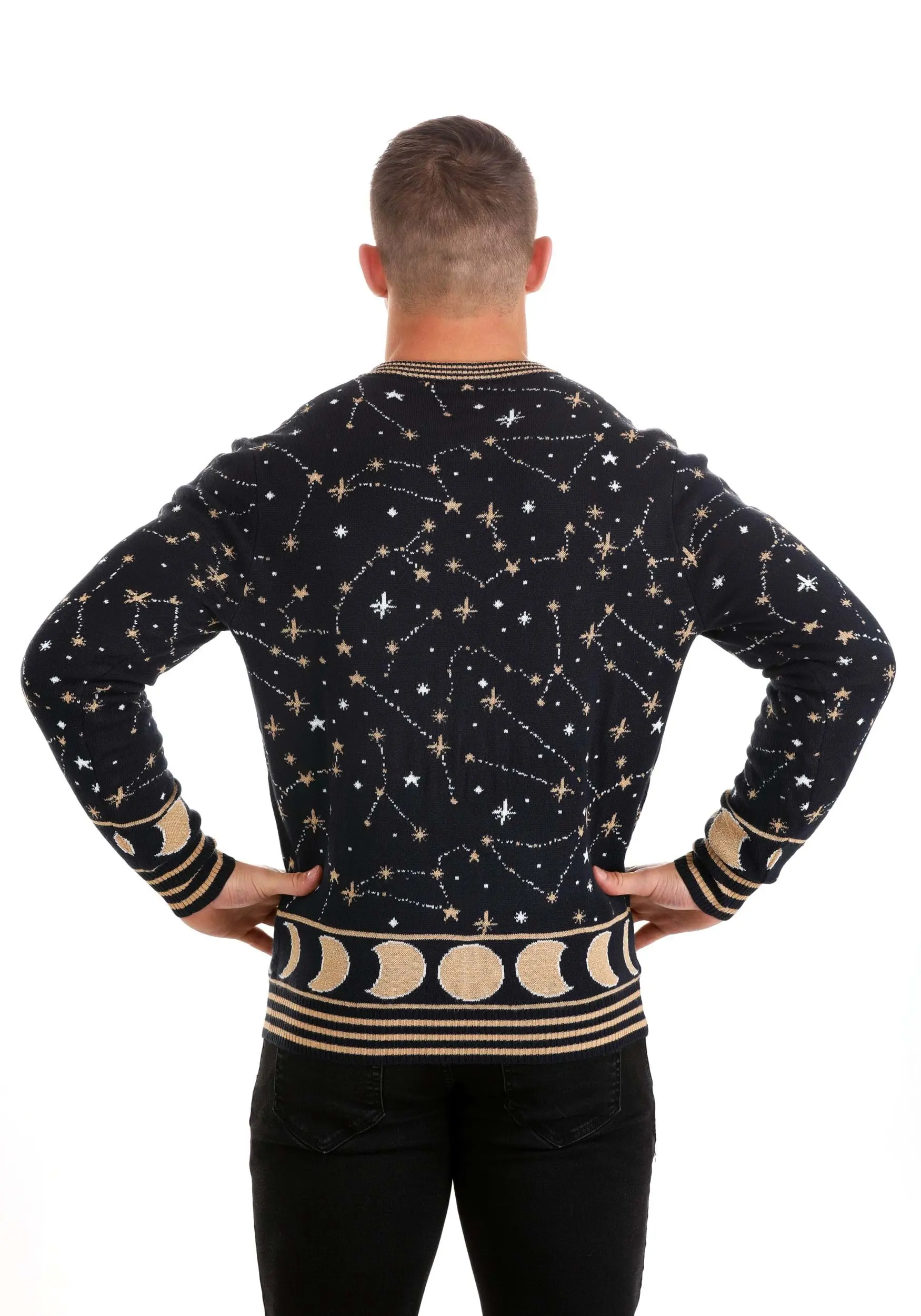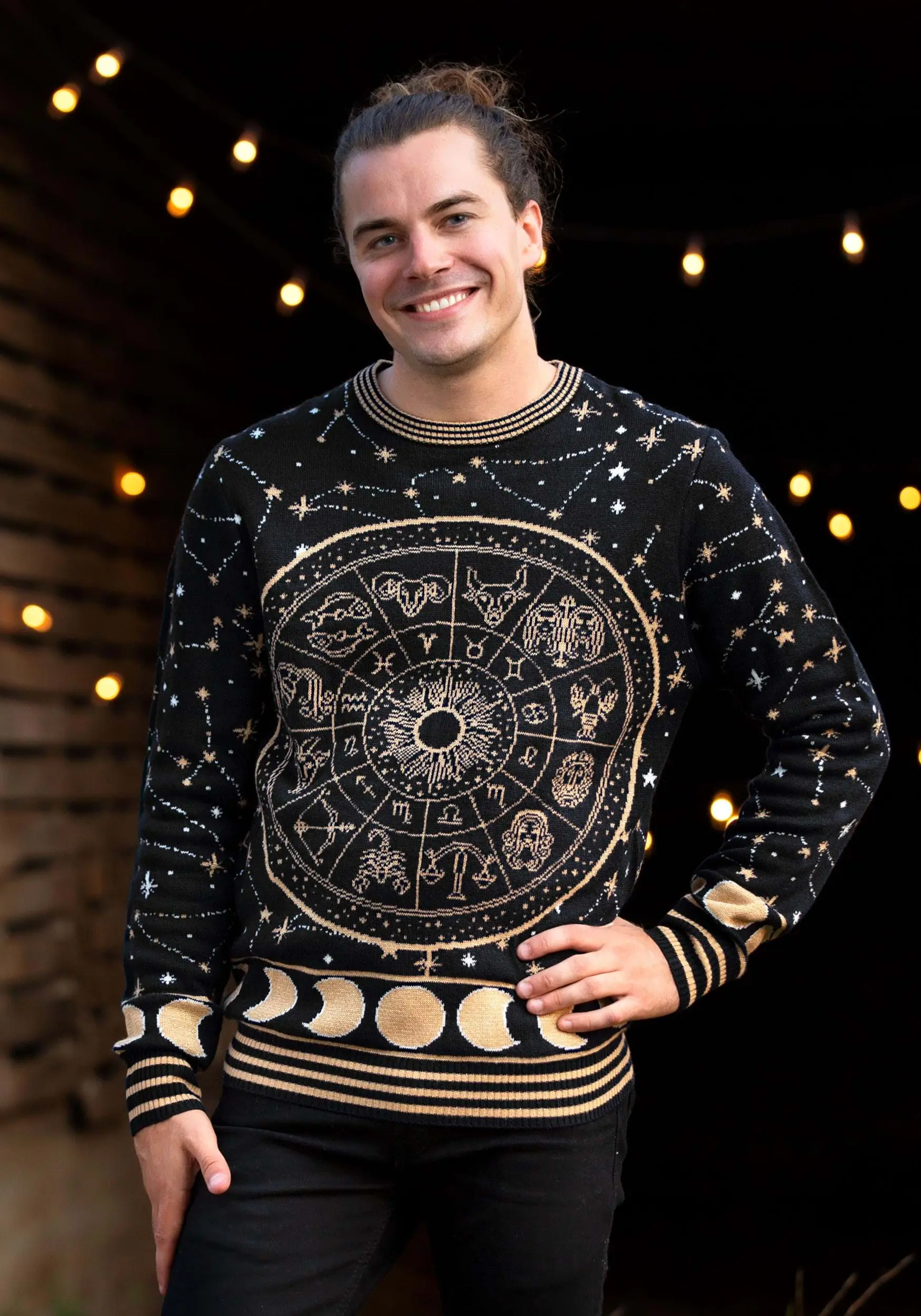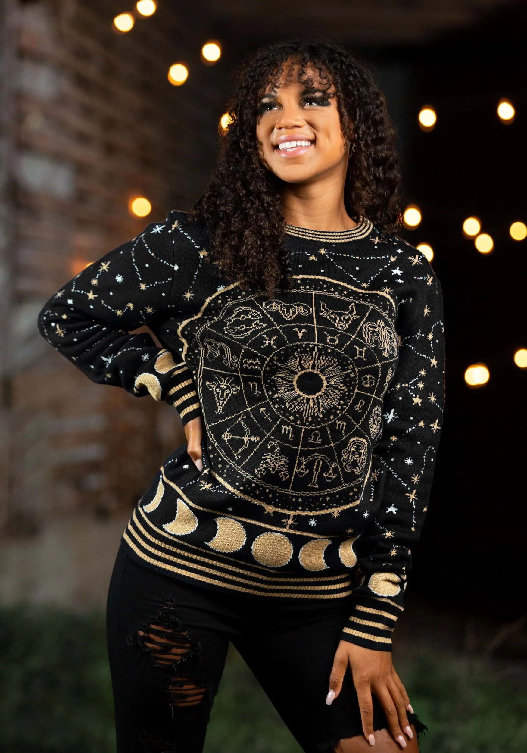 If you want to cozy up with your celestial sign, then this Astrology Signs Halloween Sweater has you covered. The knit-sweater comes with all of the zodiac signs crafted right into the front of the sweater in gold. The rest of the sweater has an all-over design featuring stars and constellations to help you chart out your own astrological inclinations. The sleeves and waistband have rib-knitting to help provide a snug and cozy fit. Finally, the moon cycles adorn the bottom of the sweater and the sleeve cuffs to round out the whole look!