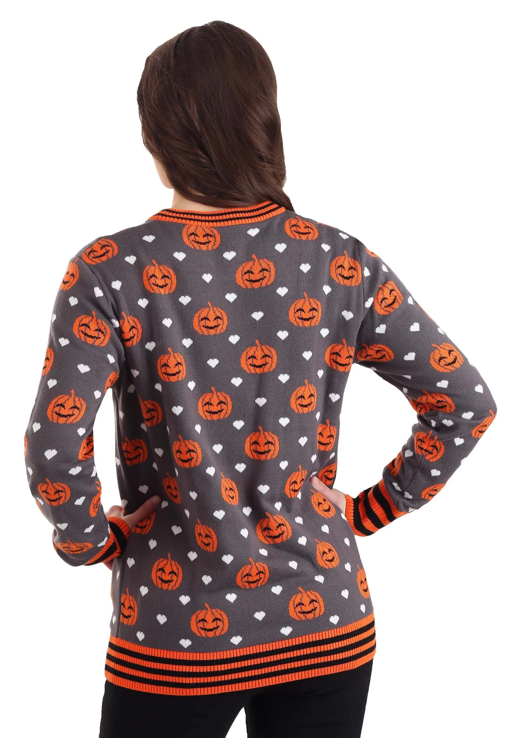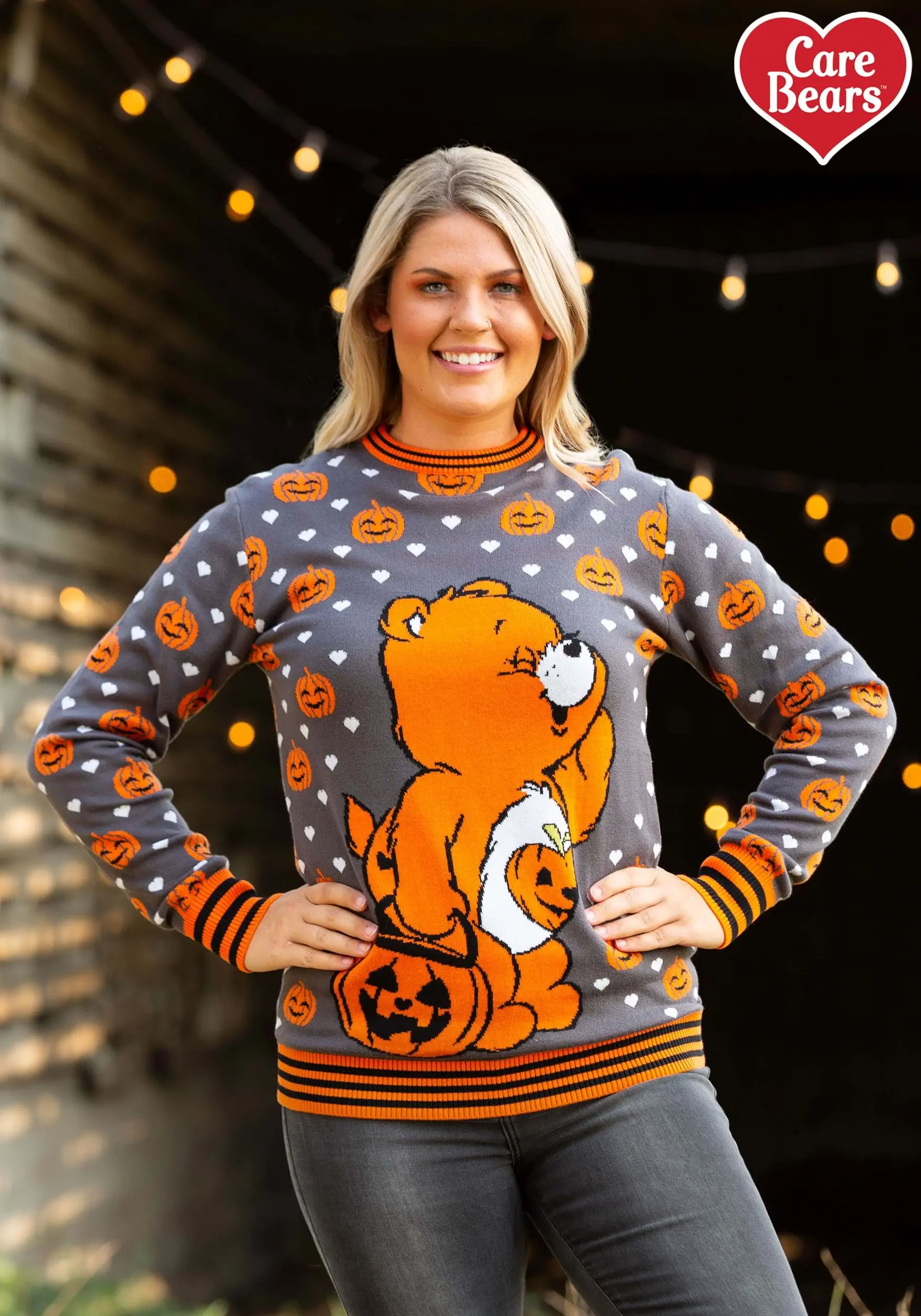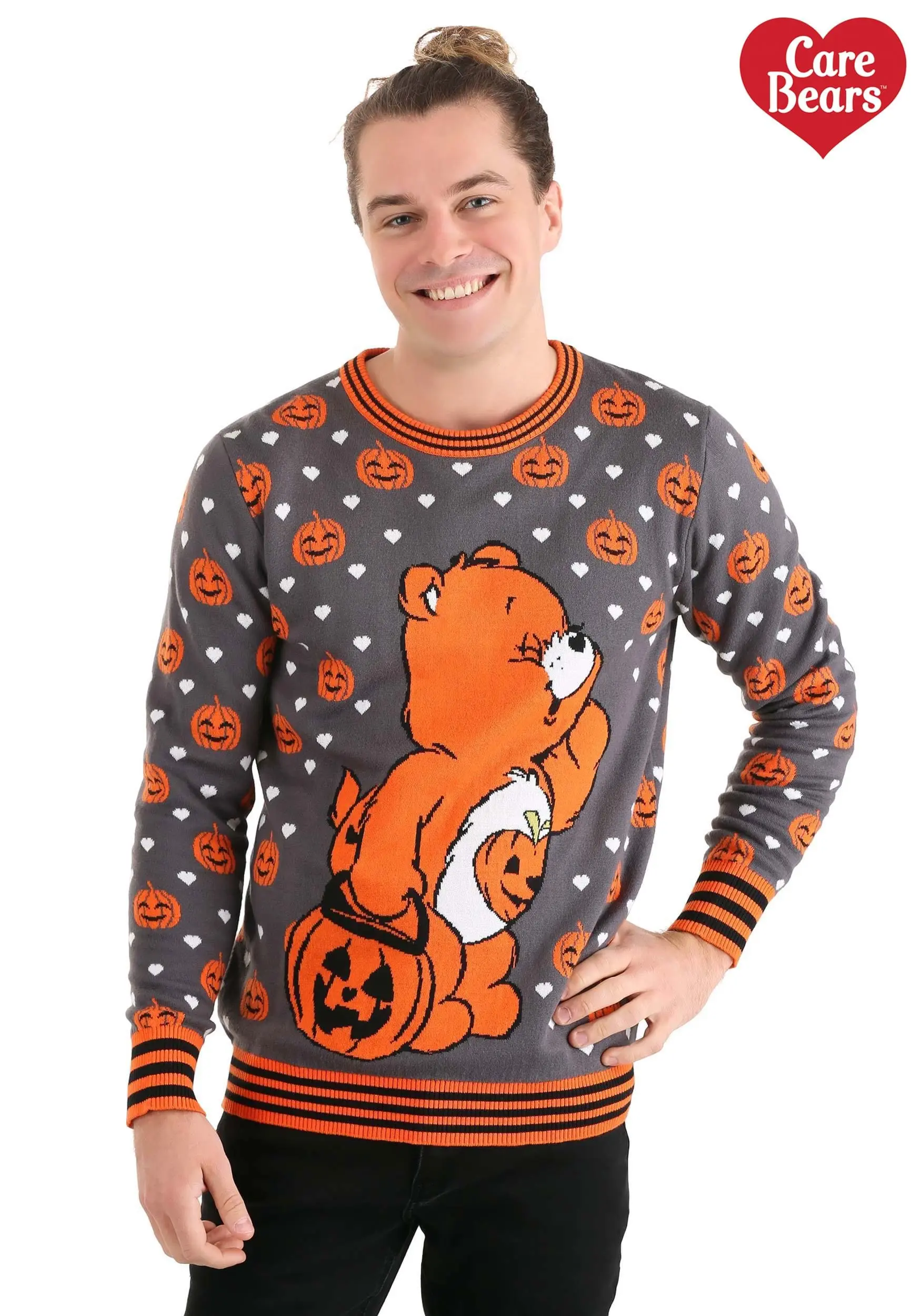 If you’d like to share the Halloween spirit all year long, you can’t go wrong with this Care Bears Trick-or-Sweet Bear Halloween Sweater for adults. This chipper sweater offers an all-over print of grinning pumpkins and happy hearts, not to mention rib-knit cuffs and a neck and waistline trimmed with black and orange stripes. And you’ll have a belly badge of your own in the form of Trick-or-Sweet Bear on the hunt for treats!