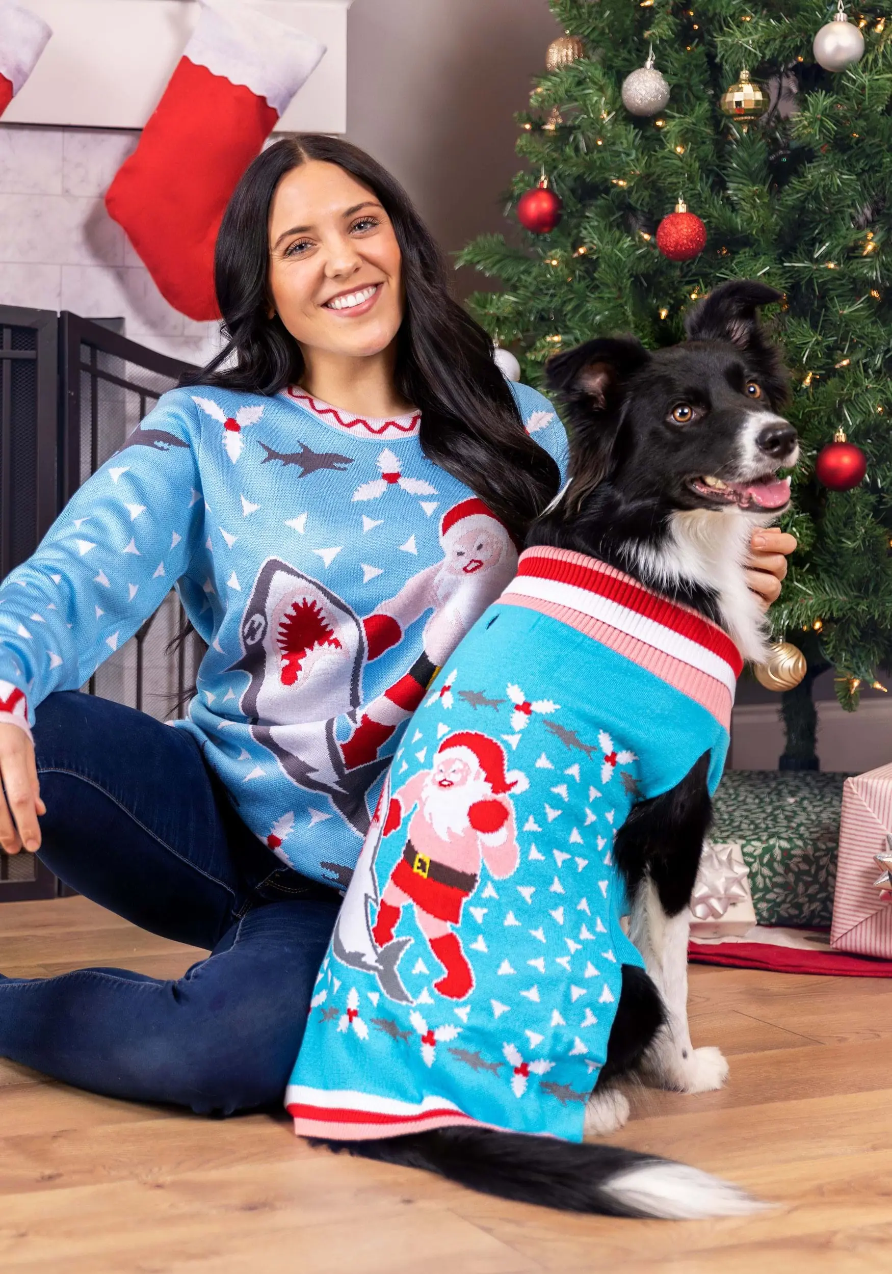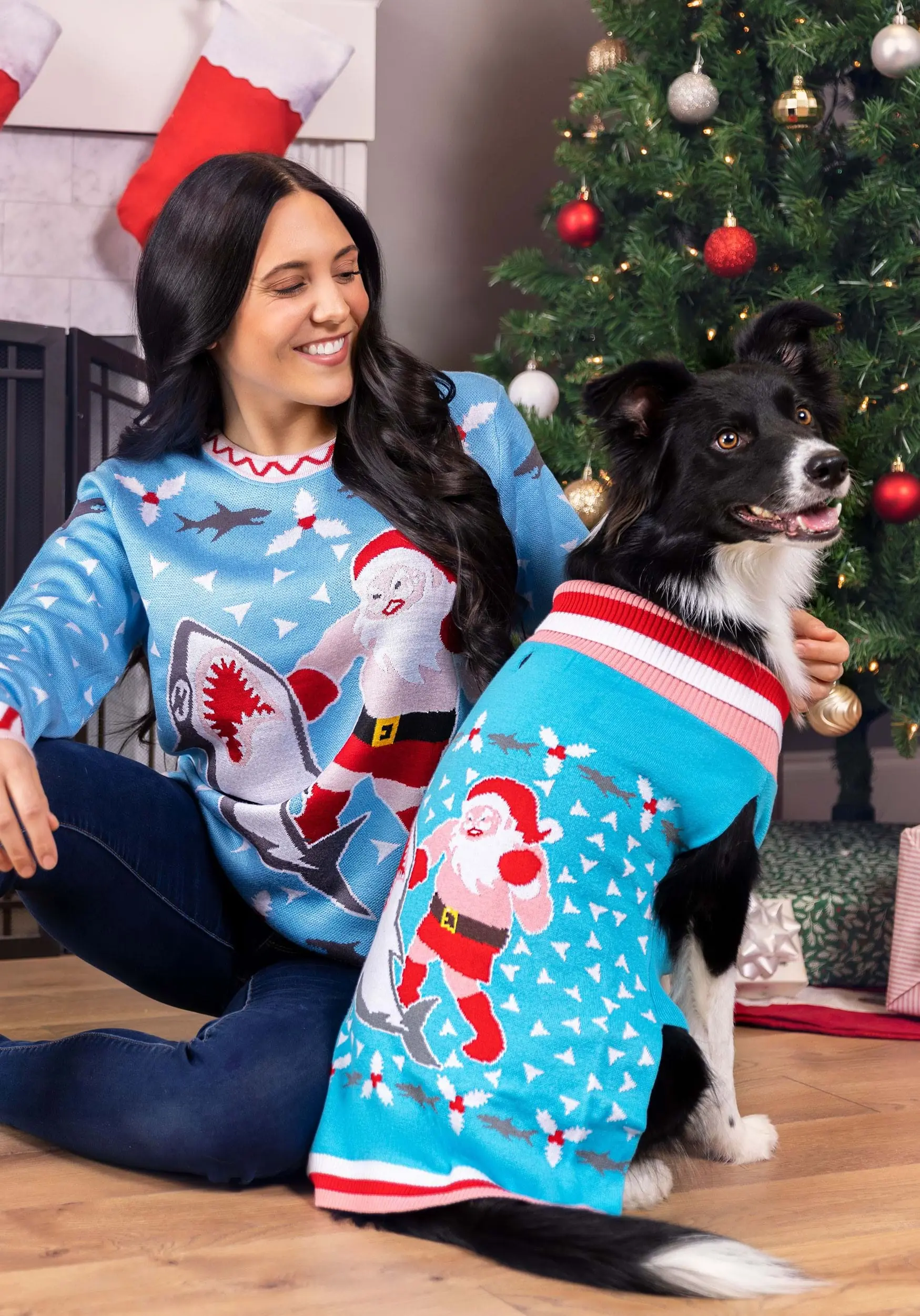 We all know that Santa Claus has a difficult job! He needs to deliver millions of presents to every good child on his nice list. He needs to be tough, and ready to tackle anything when he heads out on Christmas Eve, which is why his training regimen is intense. In this epic sweater for your doggy, our designers have captured Santa boxing a shark to keep his reflexes tight for the big day!