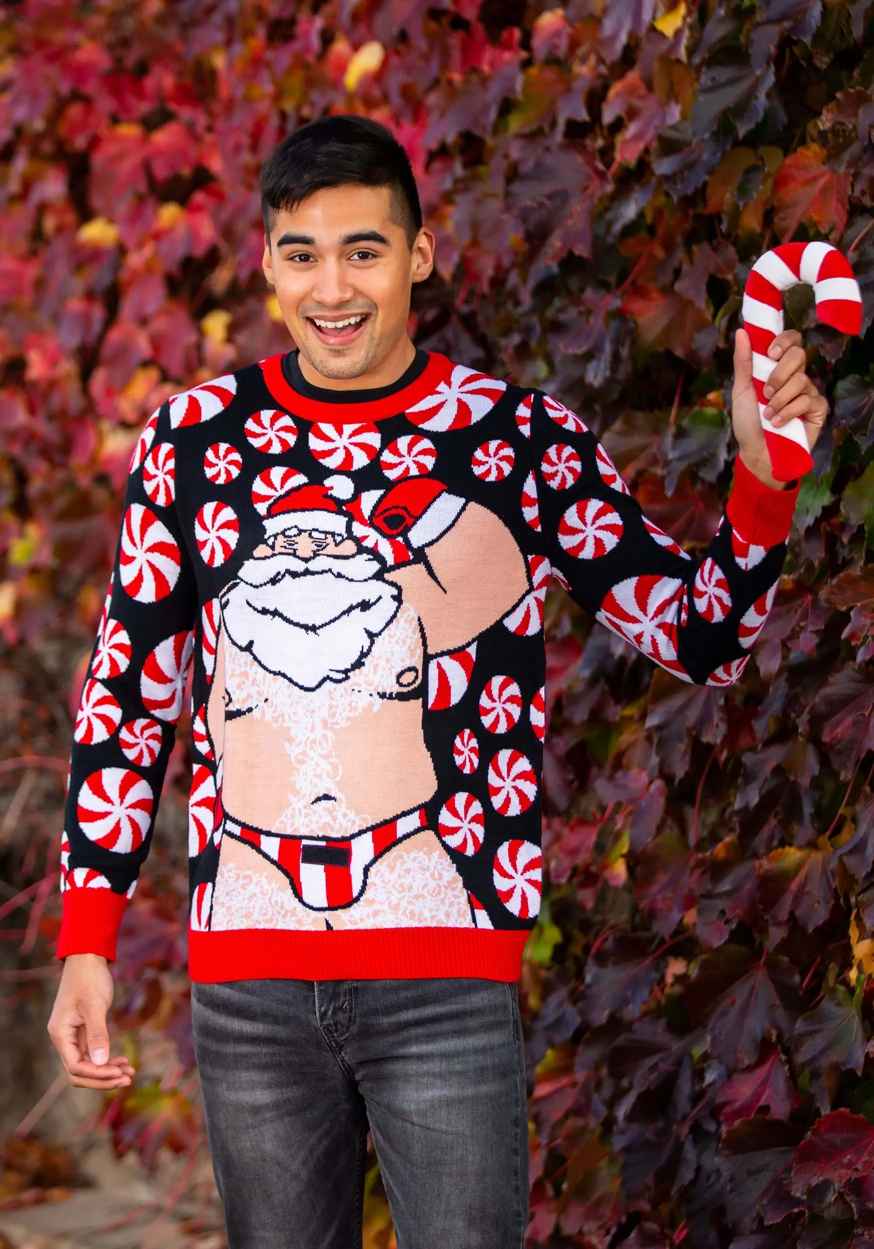 This slightly naughty ugly Christmas sweater is part of our ultra-cozy line of holiday sweaters. It’s knit from acrylic, which makes it feel just like something that grandma would have made. Of course, the design on the front… is something that grandma might not approve of. It features Santa Claus himself and he’s wearing some undies that leave very little to the imagination. Also, it comes with a giant stuffed candy cane that dangles down in front. You know… because Santa loves sweets!