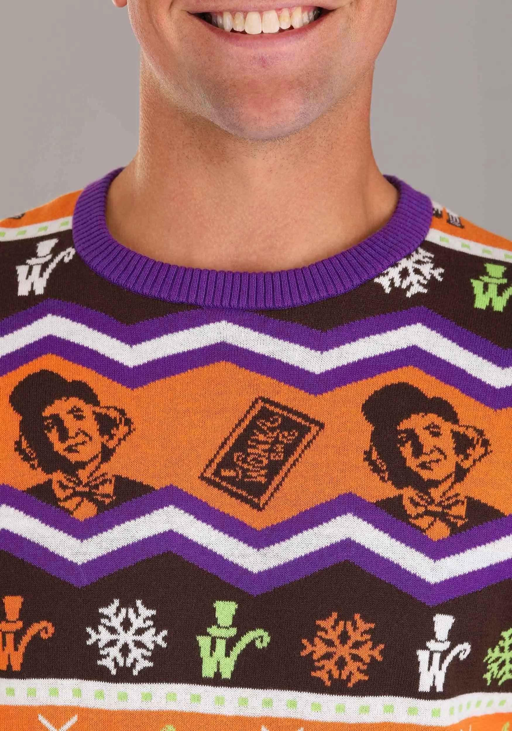 Our Willy Wonka sweater for men and women has ugly sweater styling that fans of the 1971 movie will love. The all-cotton knit sweater has a Wonka-esque color scheme that features orange, brown, purple, and green. It features a Fair Isle style design complete with the images of Oompa Loompas, snowflakes, Wonka bars, and even Willy Wonka himself! With a unisex fit, this sweet sweater is Warner Brothers officially licensed so you can proudly sport it at your next holiday party.
