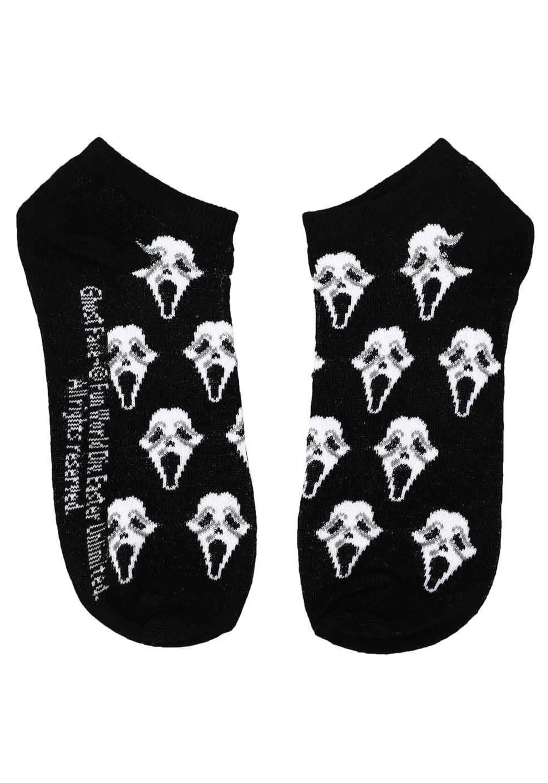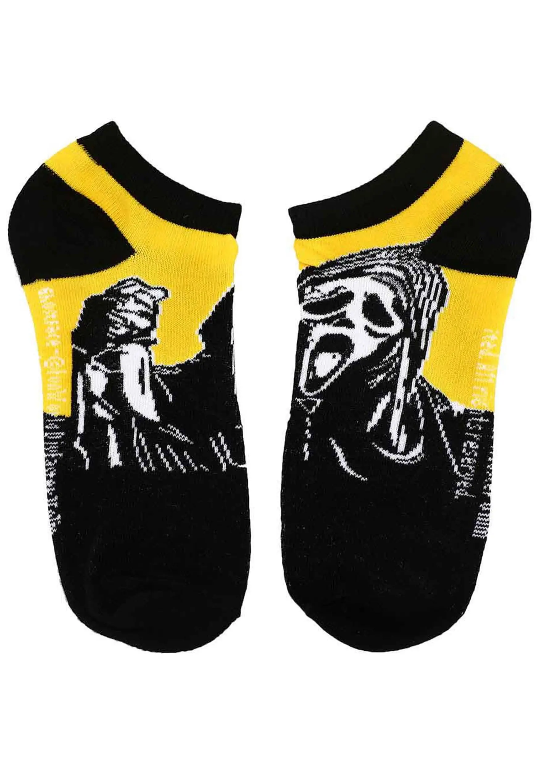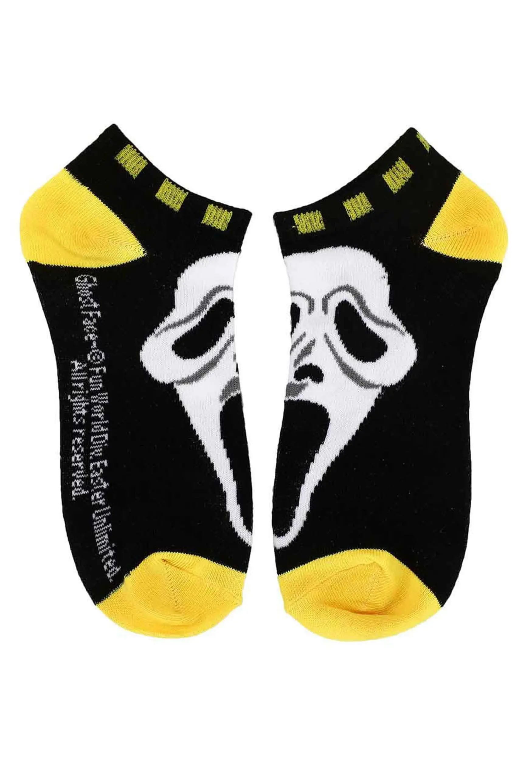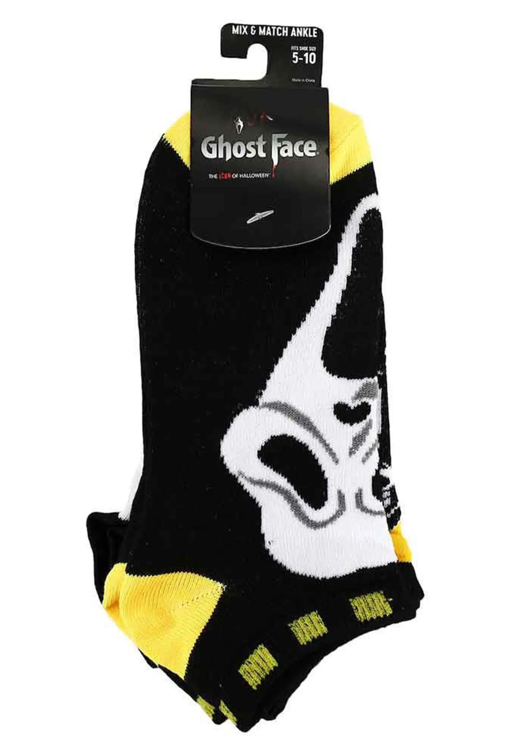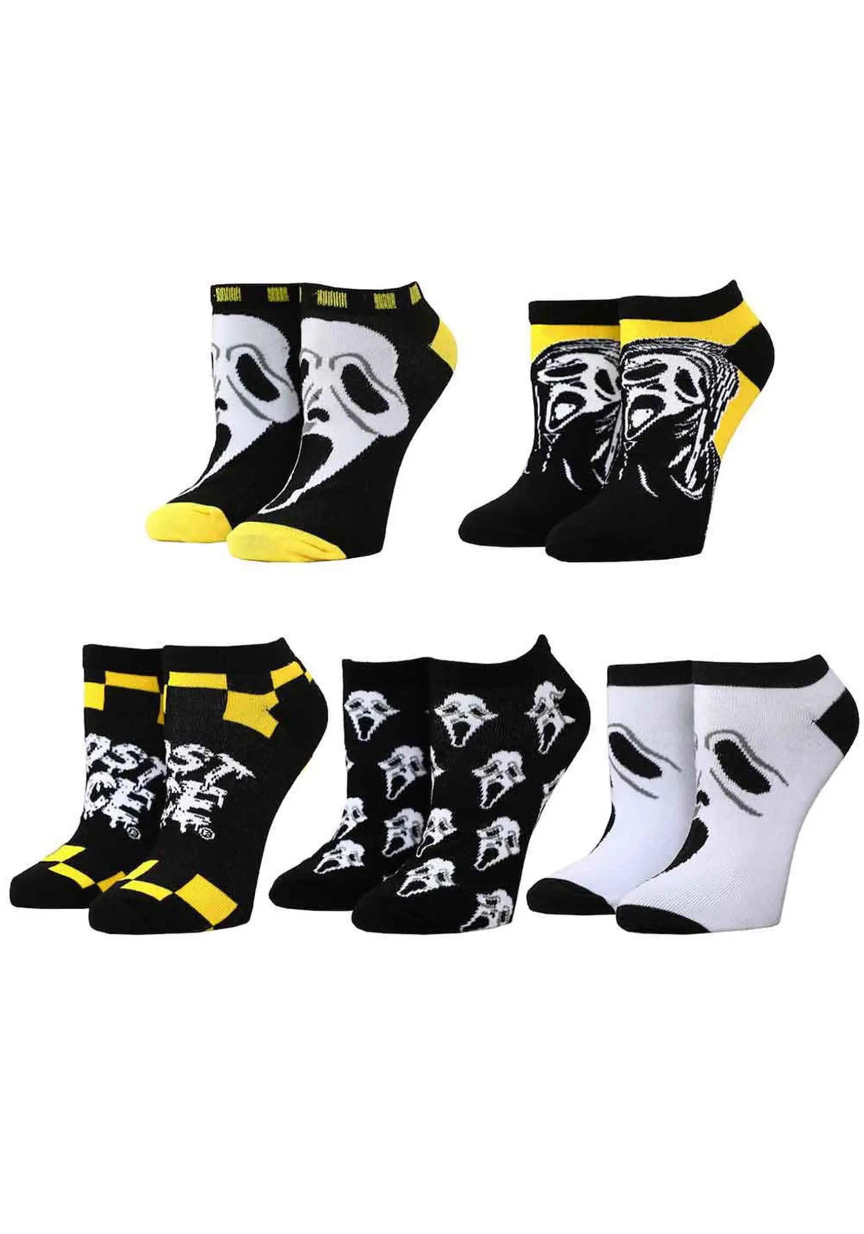 Do you like scary movies…and scary socks? This officially licensed Scream Ghost Face 5 Pack contains five separate sets of comfortable ankle socks made of black, yellow, and white material. Each one has a distinct and fun print or pattern inspired by Woodsboro’s most famous psychopath.Â