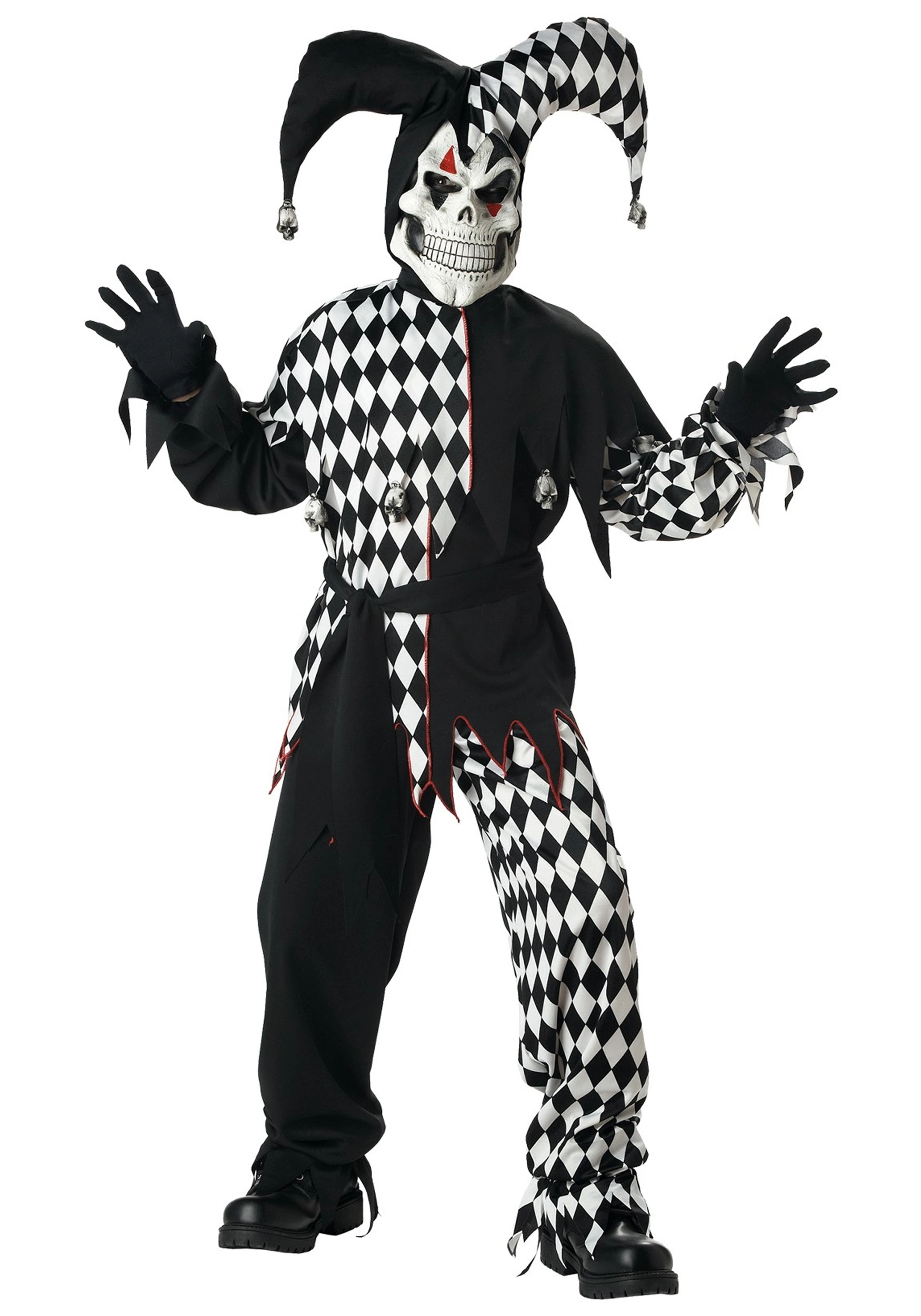 Of course, as soon as he or she puts on this black-and-white pants and shirt combo, you’ll want to set a few ground rules. Trust us, you’ll thank us for the suggestions. 1) No telling his or her little sister she’s gone color blind, since obviously the outfit is red and blue (that’s just mean). 2) No putting on the molded mask and hood and popping up in bathroom mirrors behind you while brushing your teeth. 3) Actually, come to think of it, no putting on the molded mask and hood inside the house, period (shudder). While it would certainly be scary to pull down the covers and find this dark jester resting where your little one does, this costume is bound to be a trick-or-treating hit. Just add black gloves and a jester cane for a completely evil look, and have ‘em practice that evil laugh.