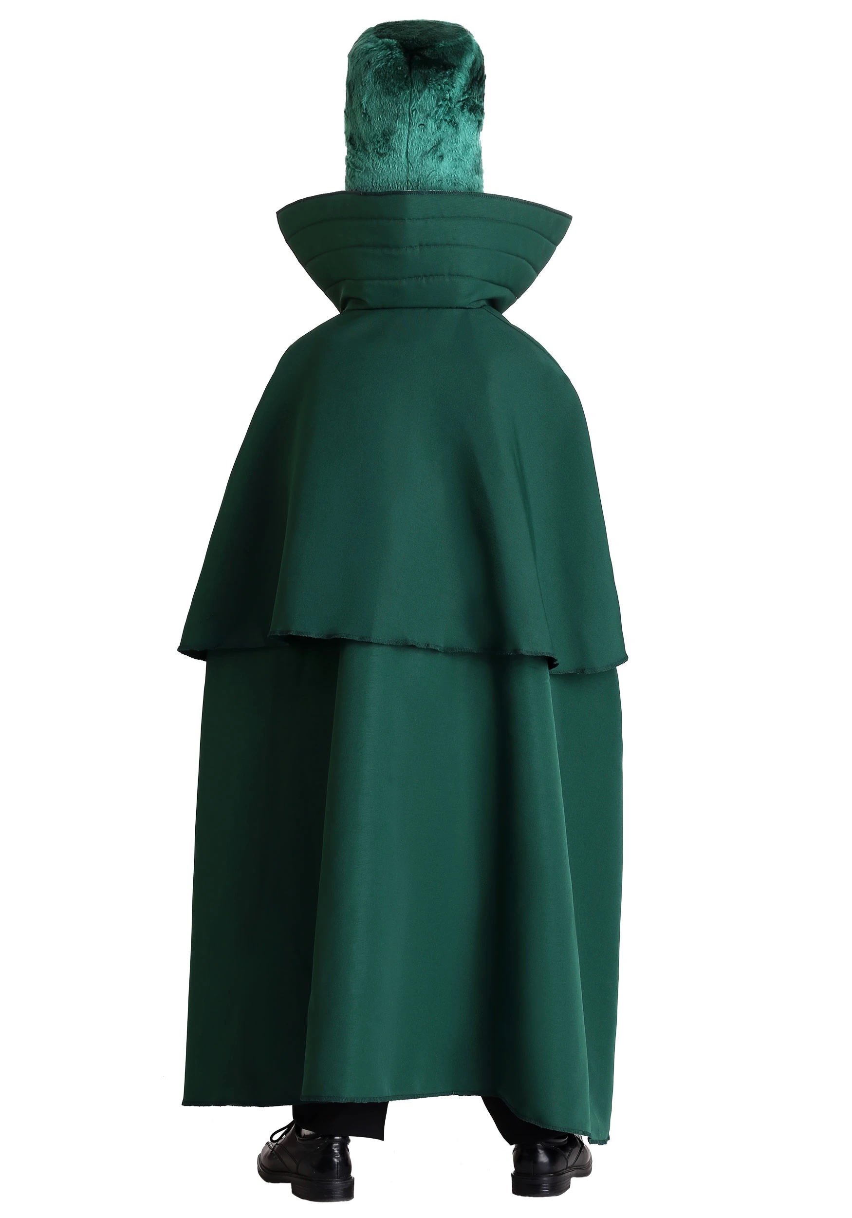 - Stand-up foam collar, Hook and Loop fastener tab at neck of dark green twill cape