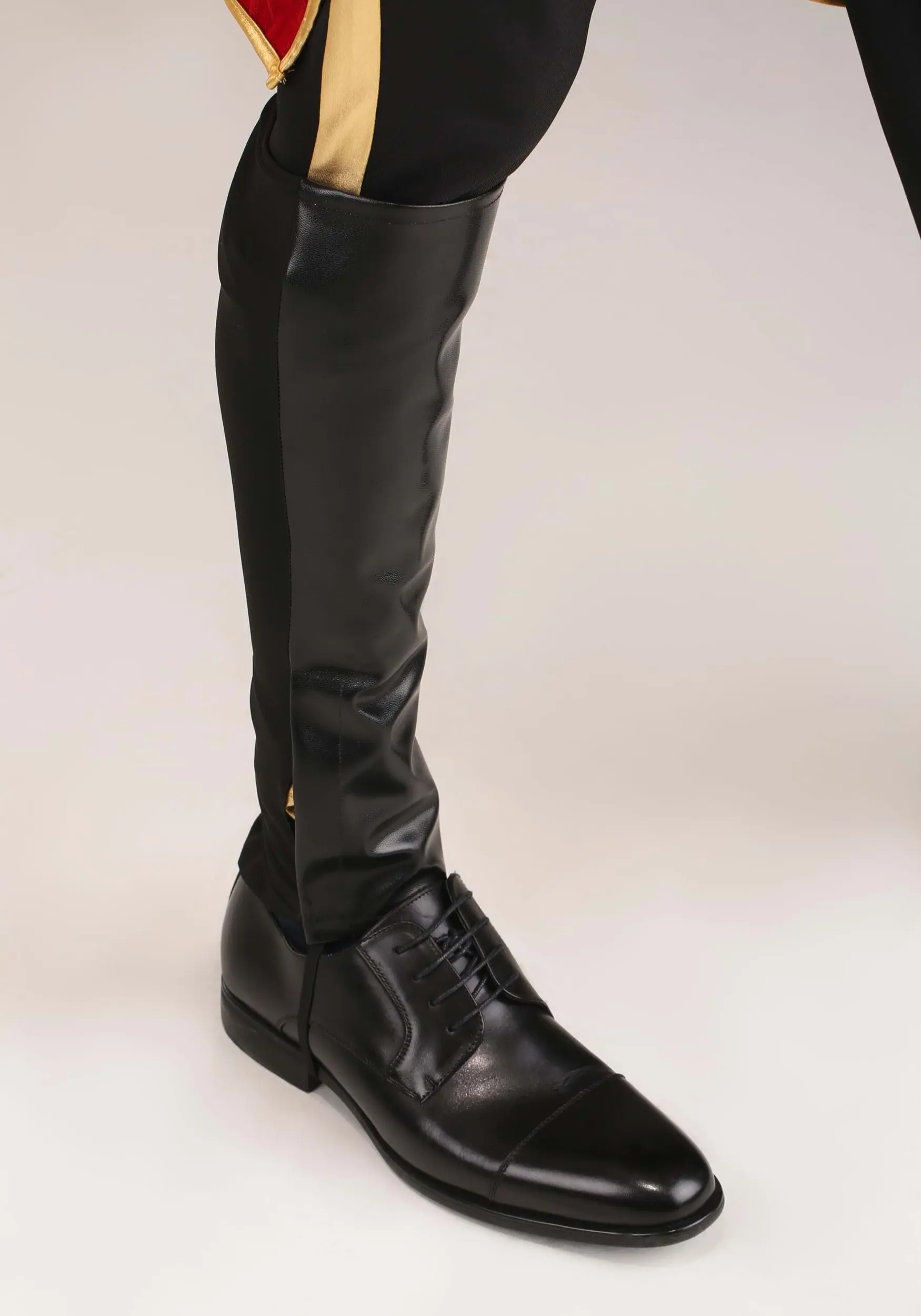 - Boot covers have faux leather front panel, stretch knit back panel, elastic under foot