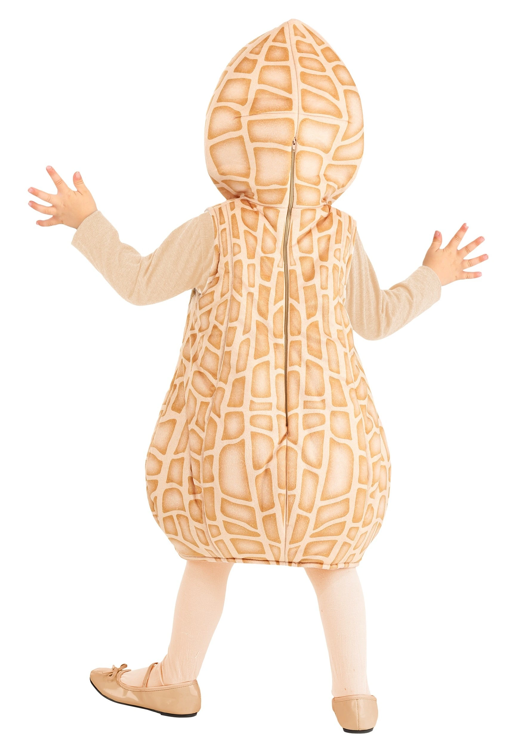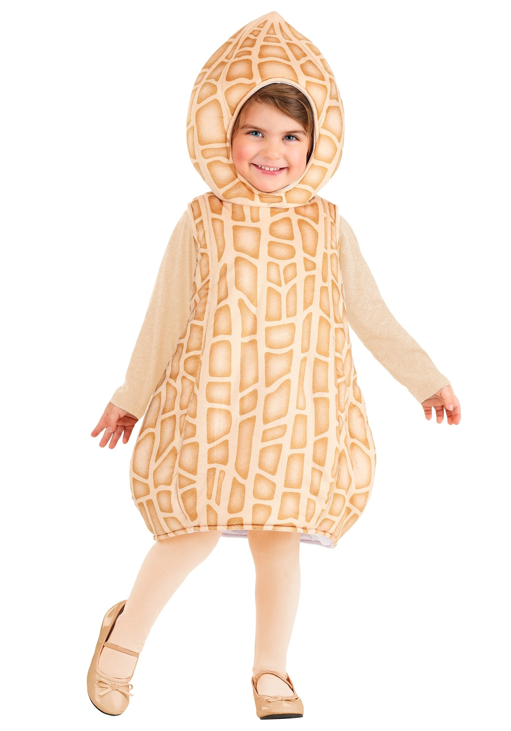 Our costume designers wanted to craft a costume for peanut lovers out there and this is what they boiled up! This Made by Us costume is an exclusive outfit that will have your little one looking like a cute peanut in no time! The costume starts with a simple tunic-bodysuit that has a printed peanut shell pattern on the exterior. It has an attached hood, which fits over your child to fully transform them into a peanut! We recommend dressing your child in a light shirt and matching tights to really put the final touches on this cute outfit.