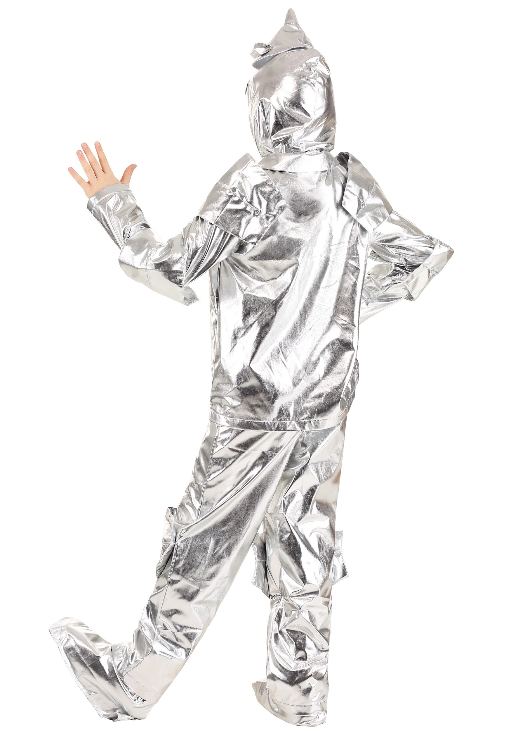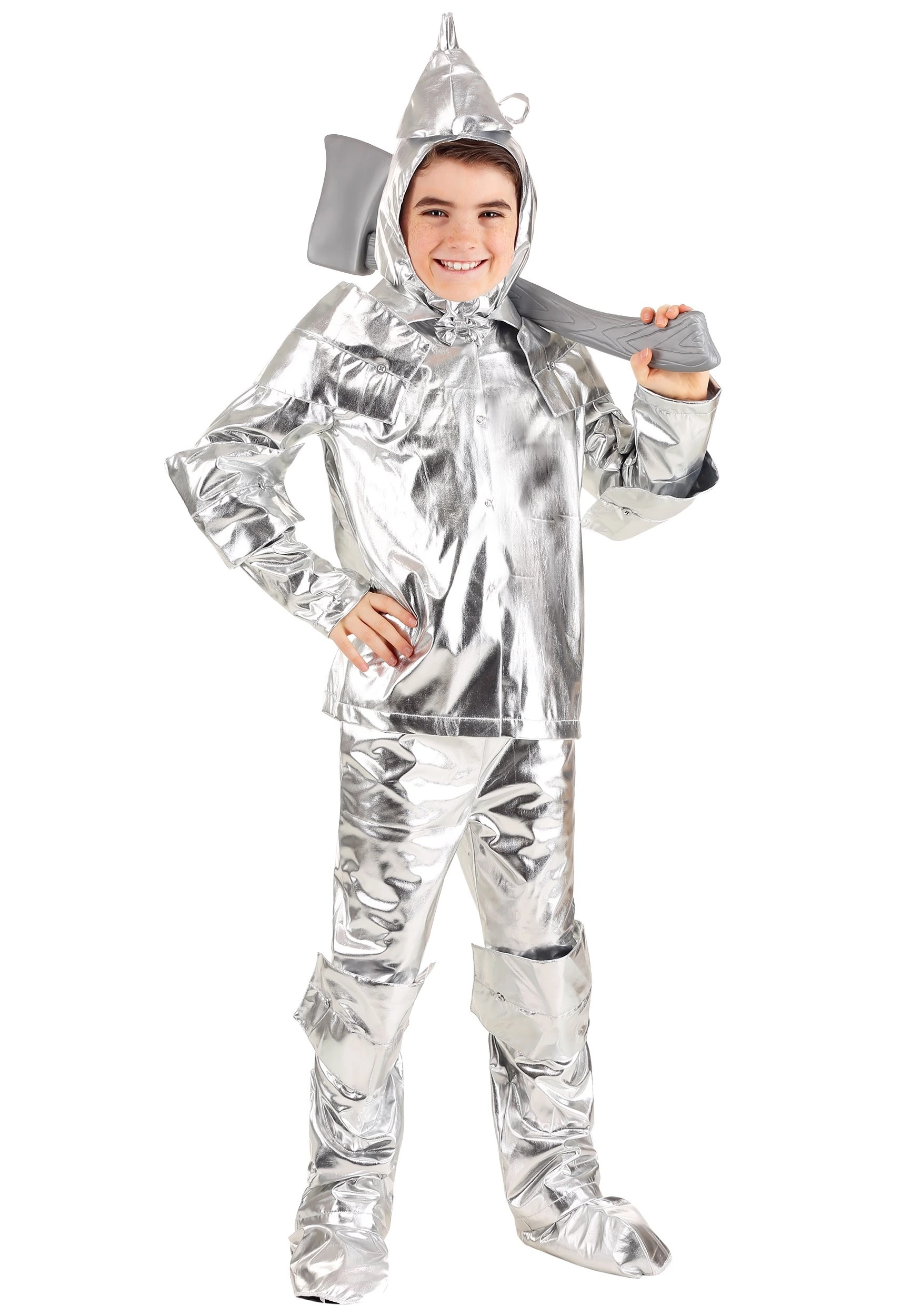 Bring a little heart to your next costume party in this exclusive Kids Tin Woodsman Costume. The costume is made out of 100 percent polyester metallic knit fabric that shines just like real tin. The shirt has metal snaps at the center front, along with decorative shoulder and elbow pads that are anchored by buttons. There are matching decorative knee pads also anchored by buttons on the pants, which also feature an elastic waistband for a comfy fit. The costume comes with a balaclava-style hood that slips over the head and has an attached funnel on top. (The funnel can be stuffed with tissue if desired to maintain its shape.) To complete the outfit, there are also shoe covers with elastic at the ankles and underfoot. With this costume, you’ll look like a bonafide tin woodsman from head to toe!