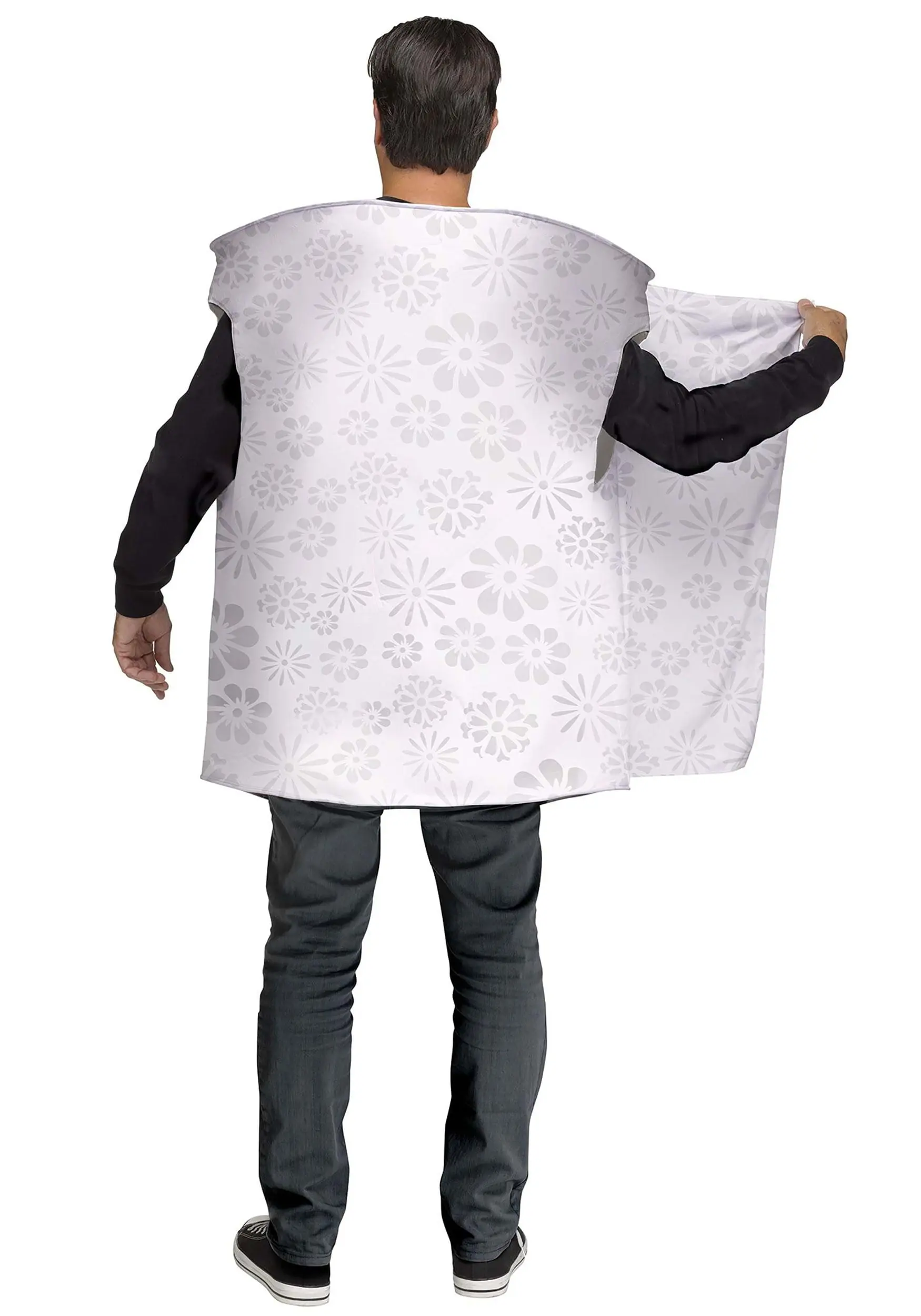 Show your appreciation of our unsung hero with this Toilet Paper Costume! It has a wire rim to keep that nice round shape and a printed flower design to look like the real thing. The tunic goes over any outfit so you can stay comfy in your own clothes while still showing off a unique costume. You could also get a friend to dress up as a toilet (or even the poop that goes in it) and have a fun group theme!