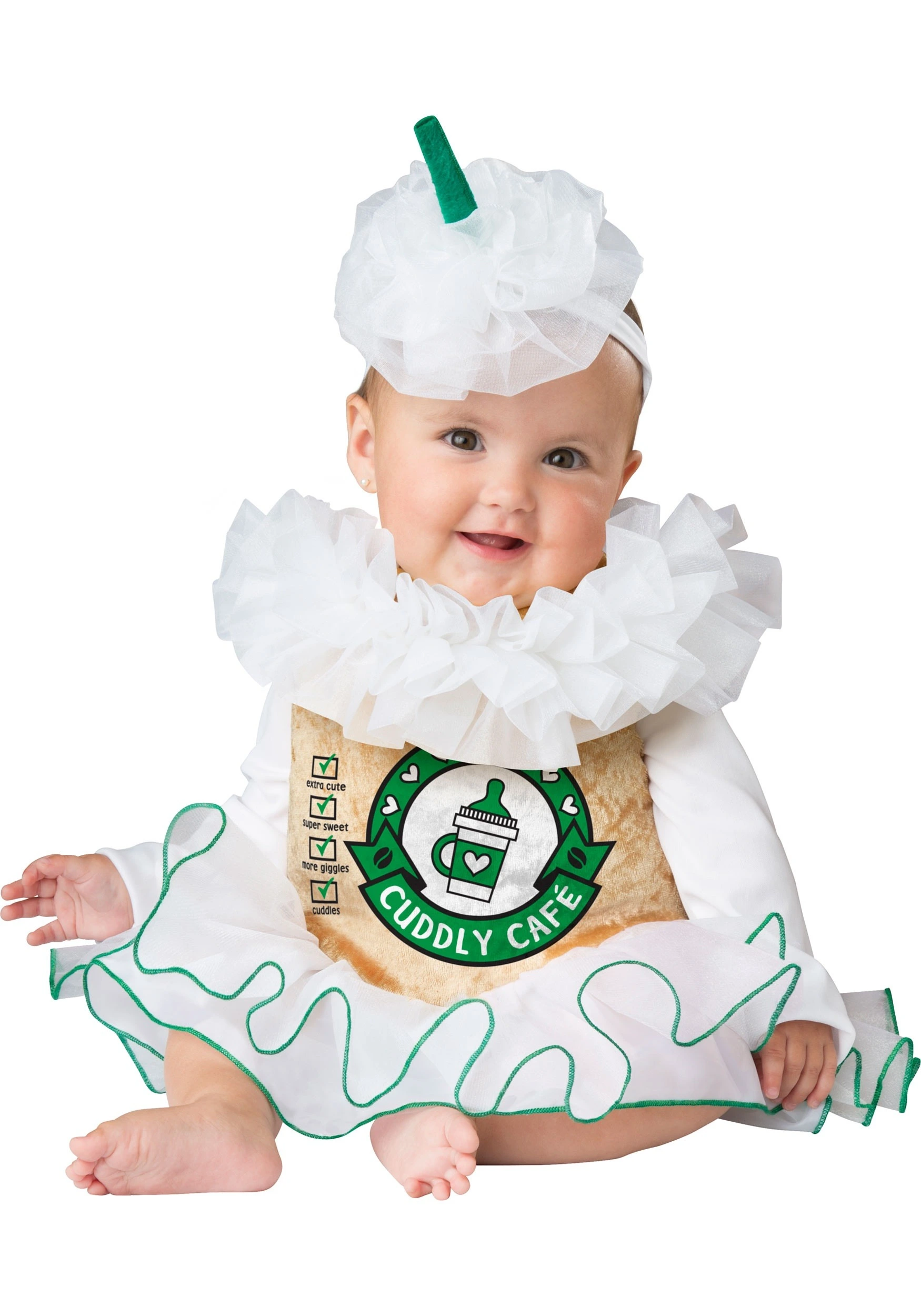 This infant costume turns your baby bundle of joy into a delicious cup of cappuccino! Well, not literally, of course, but it does give her an outfit that looks like a tasty cup of your favorite drink. It has a cute little tutu skirt and the main section looks like a cup from your favorite coffee shop. It even has a frilled collar that makes your little one look totally frothy. The headband also has the same creamy color, but it also has an adorable little stirrer on top. Once your little one has it on, you’ll experience and whole new level of love that you would have never thought possible!