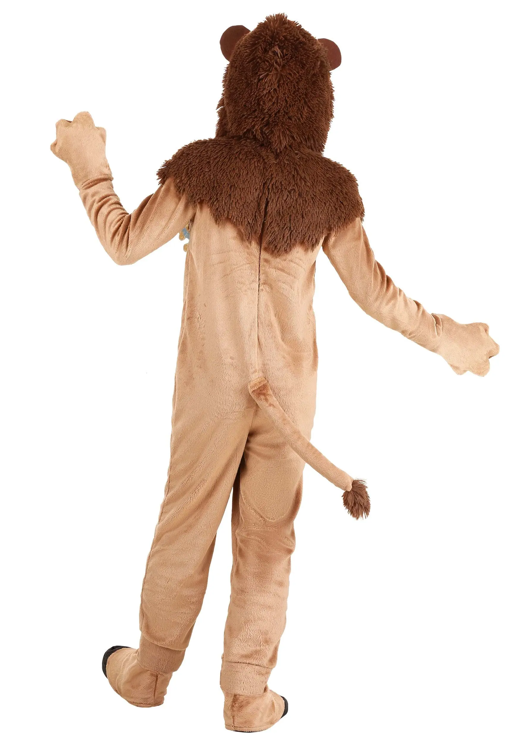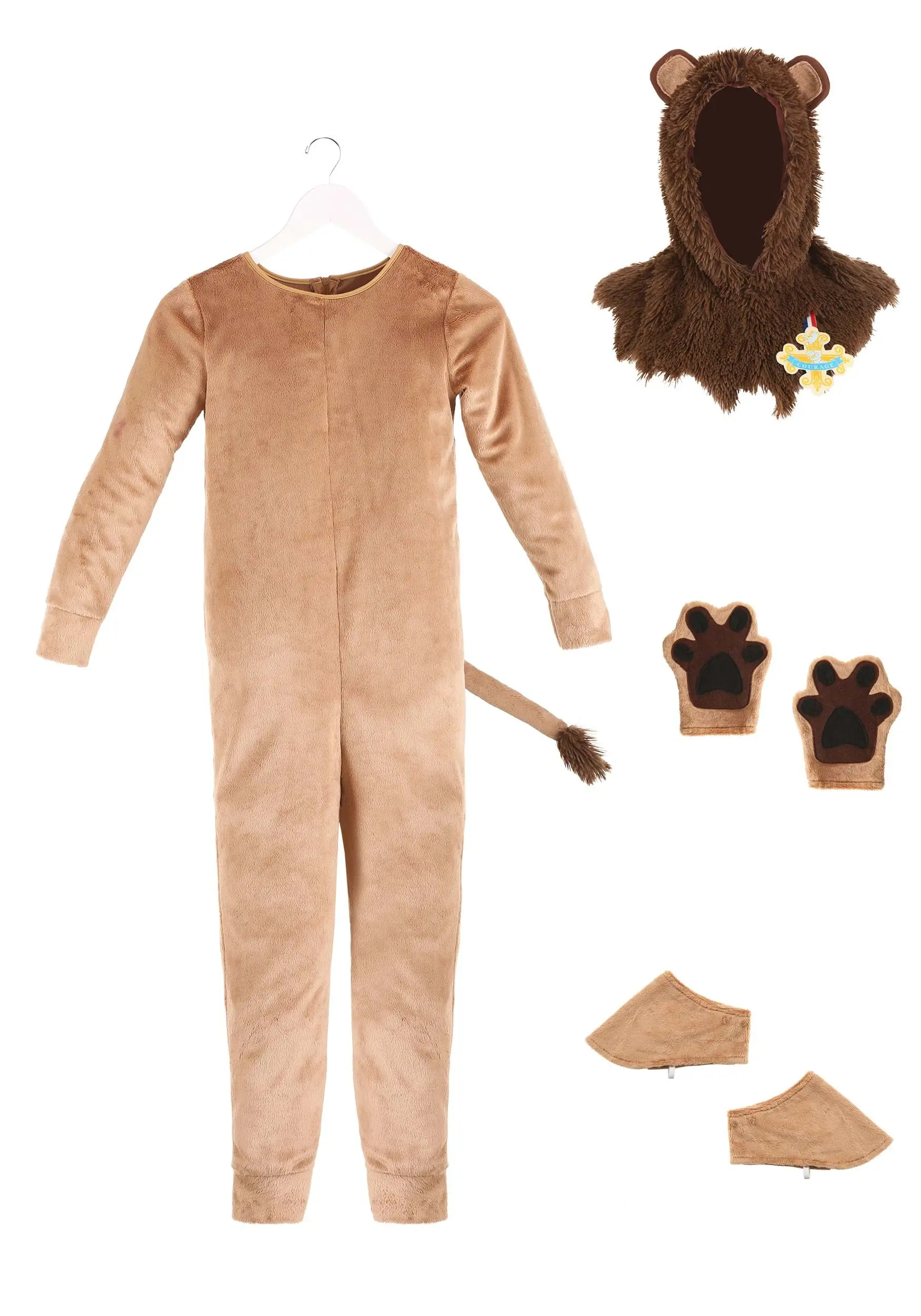 This cozy costume starts with a soft, velour jumpsuit that fits with a zipper in the back. The sleeves feature attached mitts that can be worn on or off the hands. The stuffed tail has a faux fur exterior and attaches to the back of the suit with a fastener. The hood is has a thick, dark brown mane made out of more faux fur and it even has a pair of cute little lion ears on top. The foot covers are designed to work with most shoes, so your child can wear their most comfortable pair of shoes with this outfit. Finally, the costume comes with a courage medal as proof of their newfound bravery!