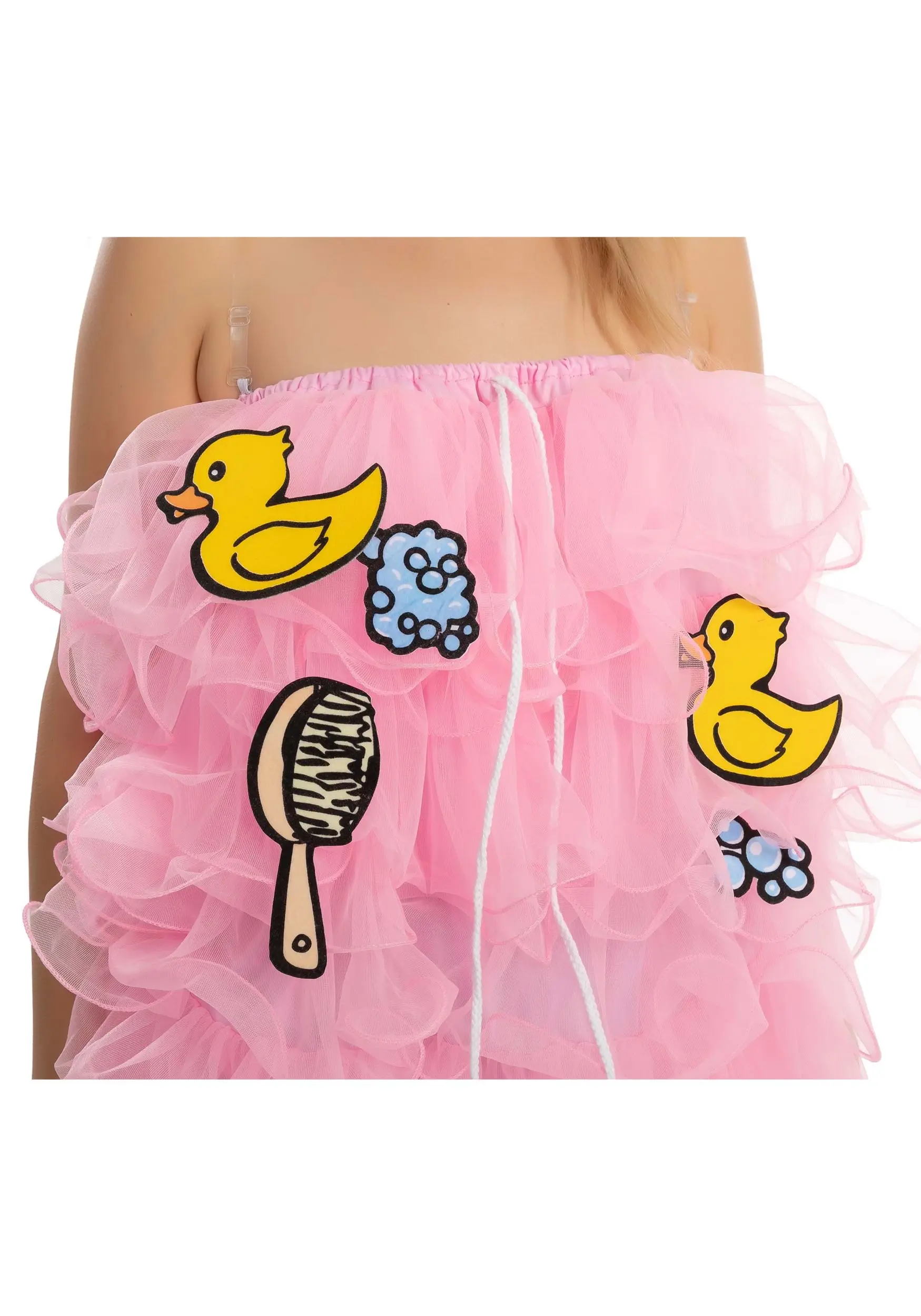 Look squeaky clean and super cute in your Adult Soap and Loofa Couples Costume! The set contains two tunics, the first of which is white and shaped like a rectangle, with the word “Soap” printed in caps on the front. The second tunic is a strapless number with a drawstring band and fluffy tiers of pink mesh and a matching pink shower cap. The set also includes bubble balloons that you can carry or stick on your costumes, as well as decorative stickers shaped like rubber ducks, suds, and more.