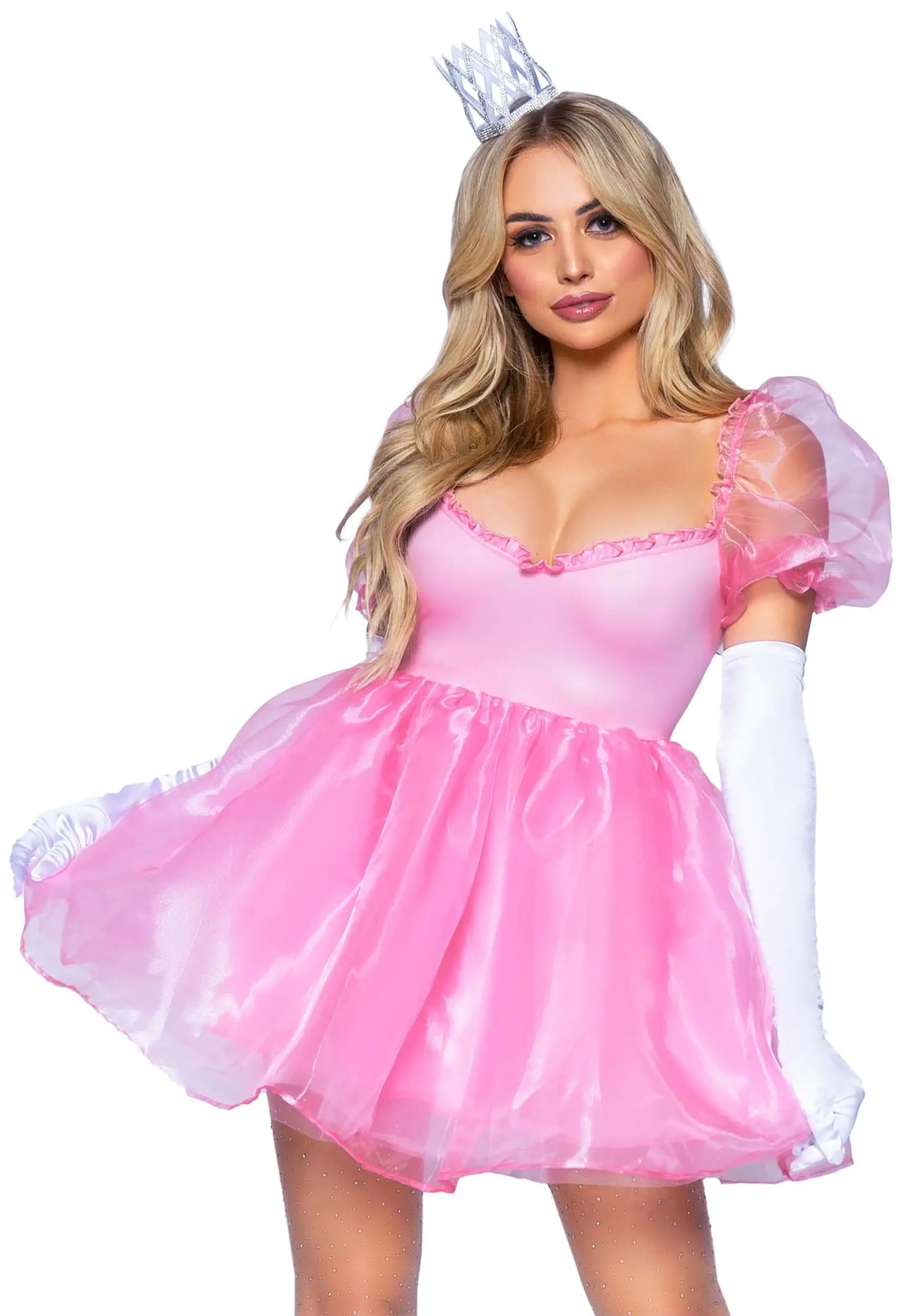 This Pink Irridescent Organza Babydoll Dress Costume for Women is only limited by your imagination! The sweet minidress is made of breathable, stretchy pink polyester and zips down the center back. Its bodice features a flattering neckline edged in ruffles and decorated with a tiny pink bow. Its puffed sleeves are made of sheer pink organza. The swishy skirt has a solid pink bottom layer and is topped with floaty organza. It’s the ideal backdrop for several different accessories, including fancy gloves, a fairy wand, a statement necklace, and even a sparkly tiara!