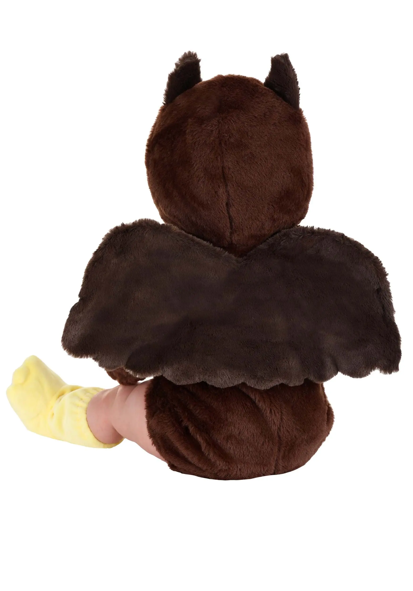It’s a wise decision to dress your child in this exclusive Bright Owl Costume for Infants! The romper zips up the front and is made of soft, short-pile brown faux fur that simulates a fledgeling’s feathers. Snaps sewn along the crotch provide easy diaper access. A white faux fur inset speckled with brown dots is sewn over the torso. The costume’s attached hood is decorated with a soft-sculpted beak, soft-sculpted tufts, and embroidered eyes. A pair of faux fur wings with wire lining attaches to the back of the romper and yellow, foam-backed velour booties slide over your child’s feet.