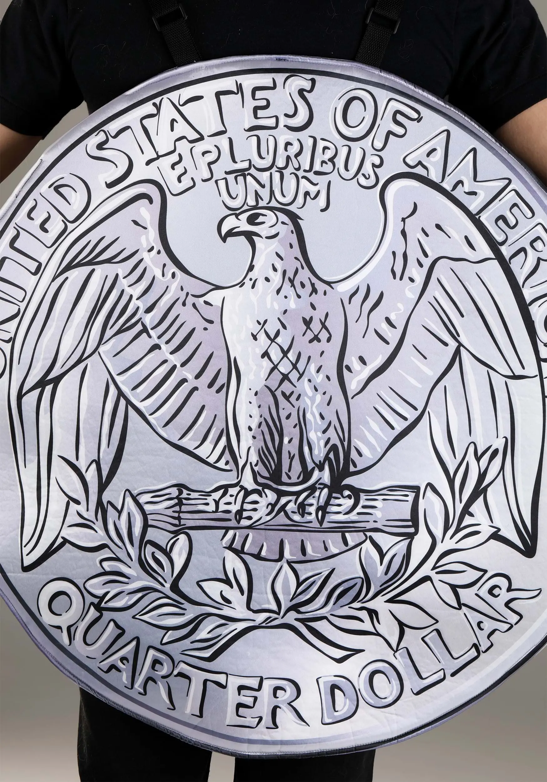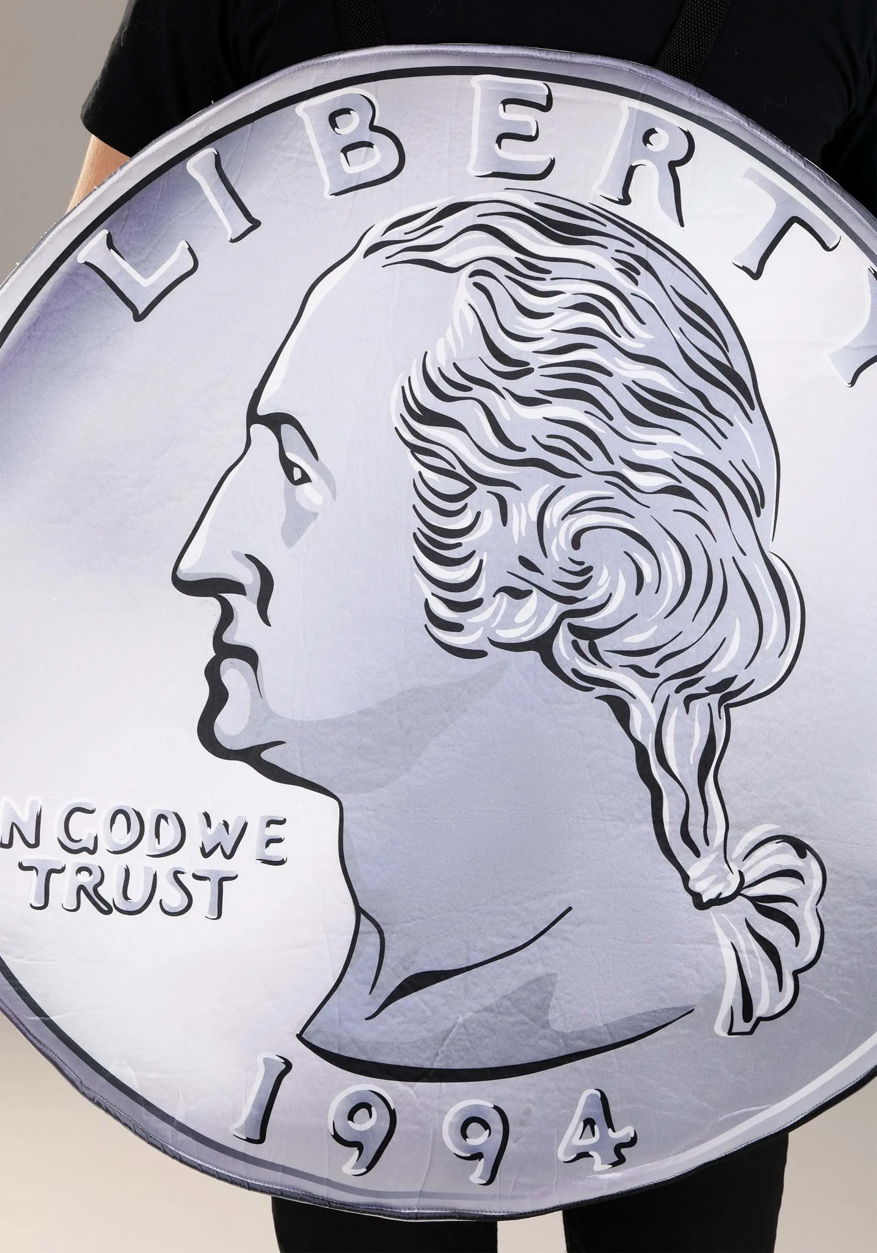 Transform into the coin that every arcade machine used to feed on! This Adult Quarter Costume is a simple costume that can be worn over any clothing, making it both quick and easy. It comes with a foam-backed tunic in a round shape. It has the shiny, silver image of a quarter on the front and back, completed with the side bust of George Washington and an eagle. The tunic fits with a pair of adjustable shoulder straps, so just toss it on over your head and you’ll be ready