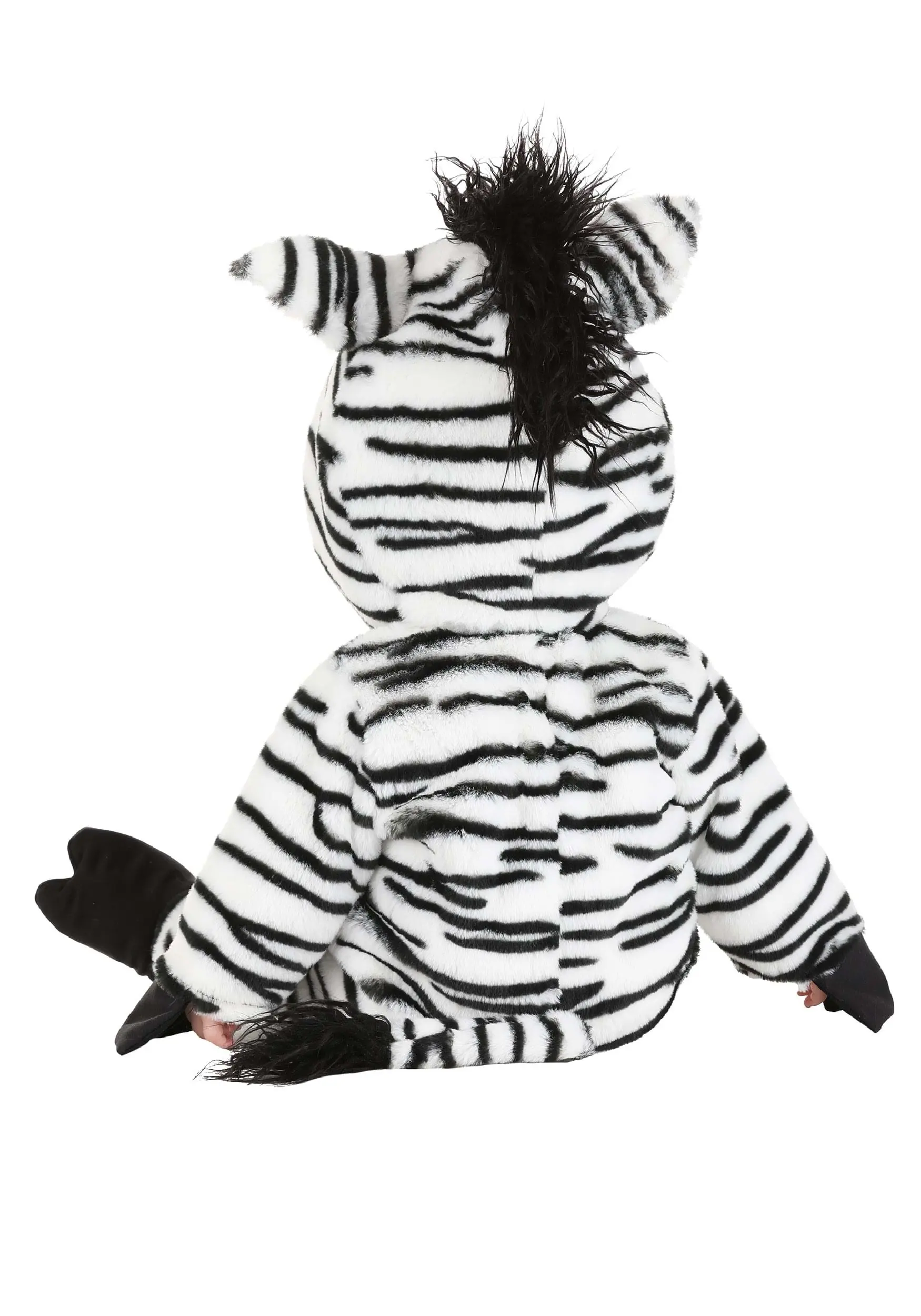 Make sure that the newest addition to your menagerie is as cozy as can be by dressing him or her in this exclusive Zebra Costume for Infants! The long-sleeved jumpsuit zips up the front and is made of polyester faux fur that’s striped with black and white zebra pattern. Black hoof-shaped flaps are sewn to the sleeve cuffs and match the hoof-shaped booties. Snaps along the inseam allow for easy diaper access. A long faux fur tail is sewn to the costume’s seat, and the hood features a stuffed muzzle as well as fabric ears, embroidered eyes, and a faux fur mane.Â