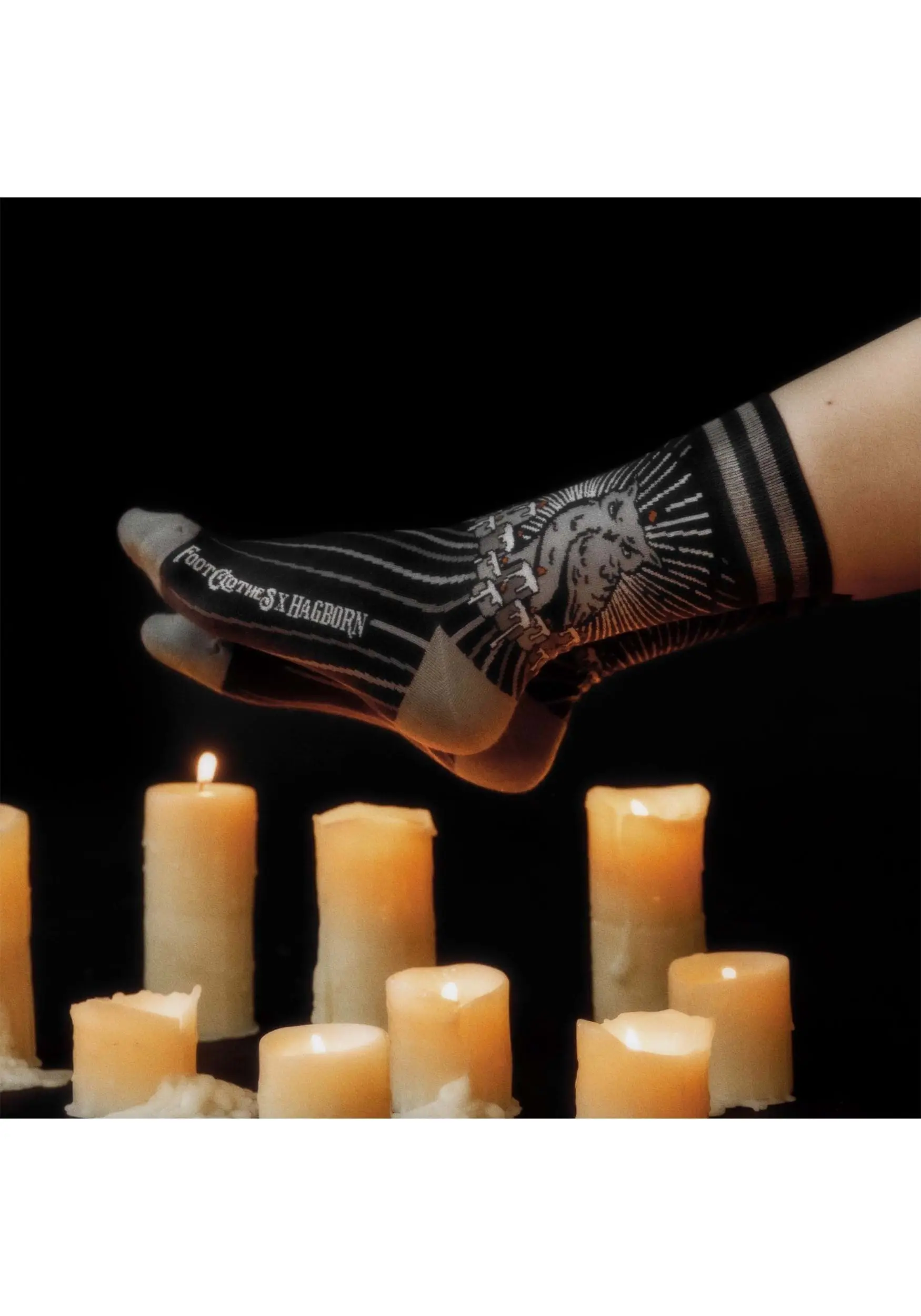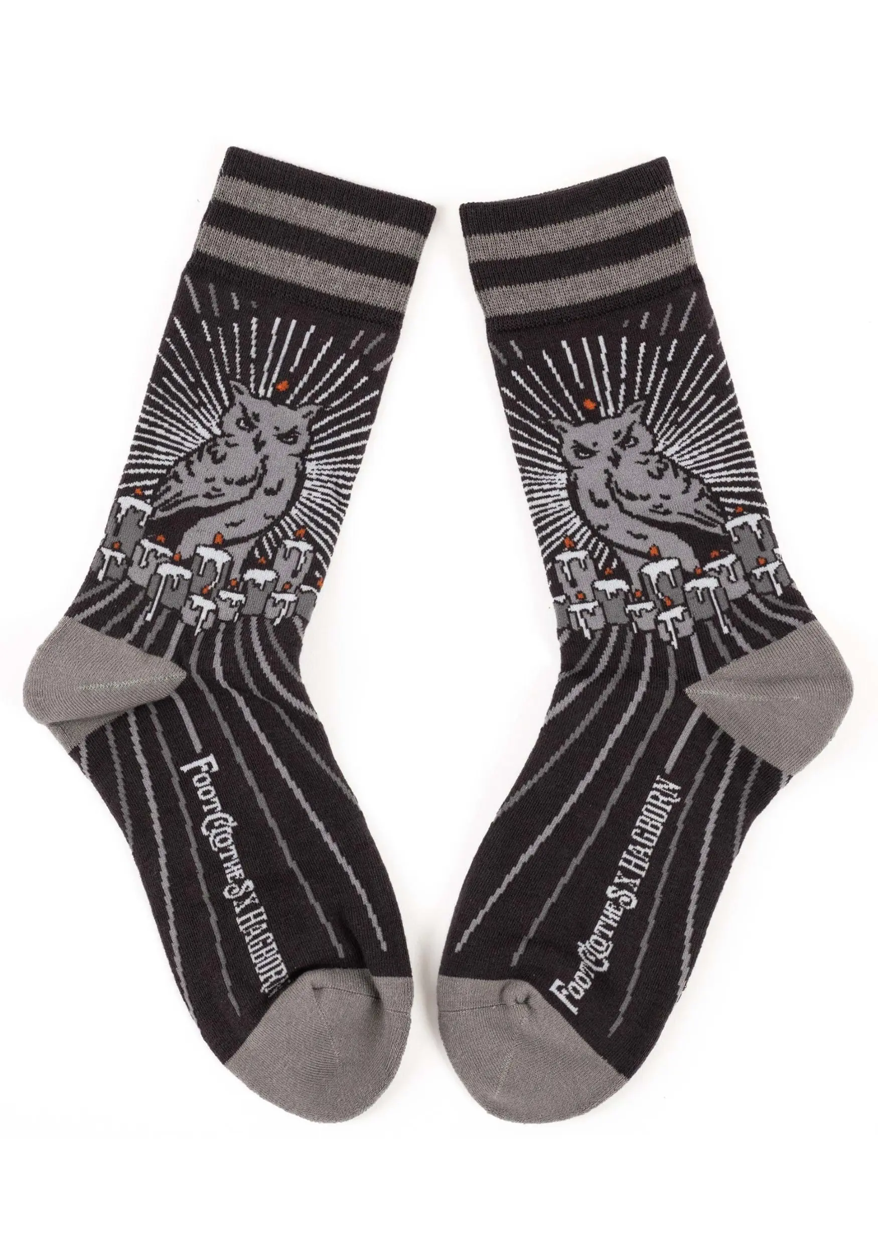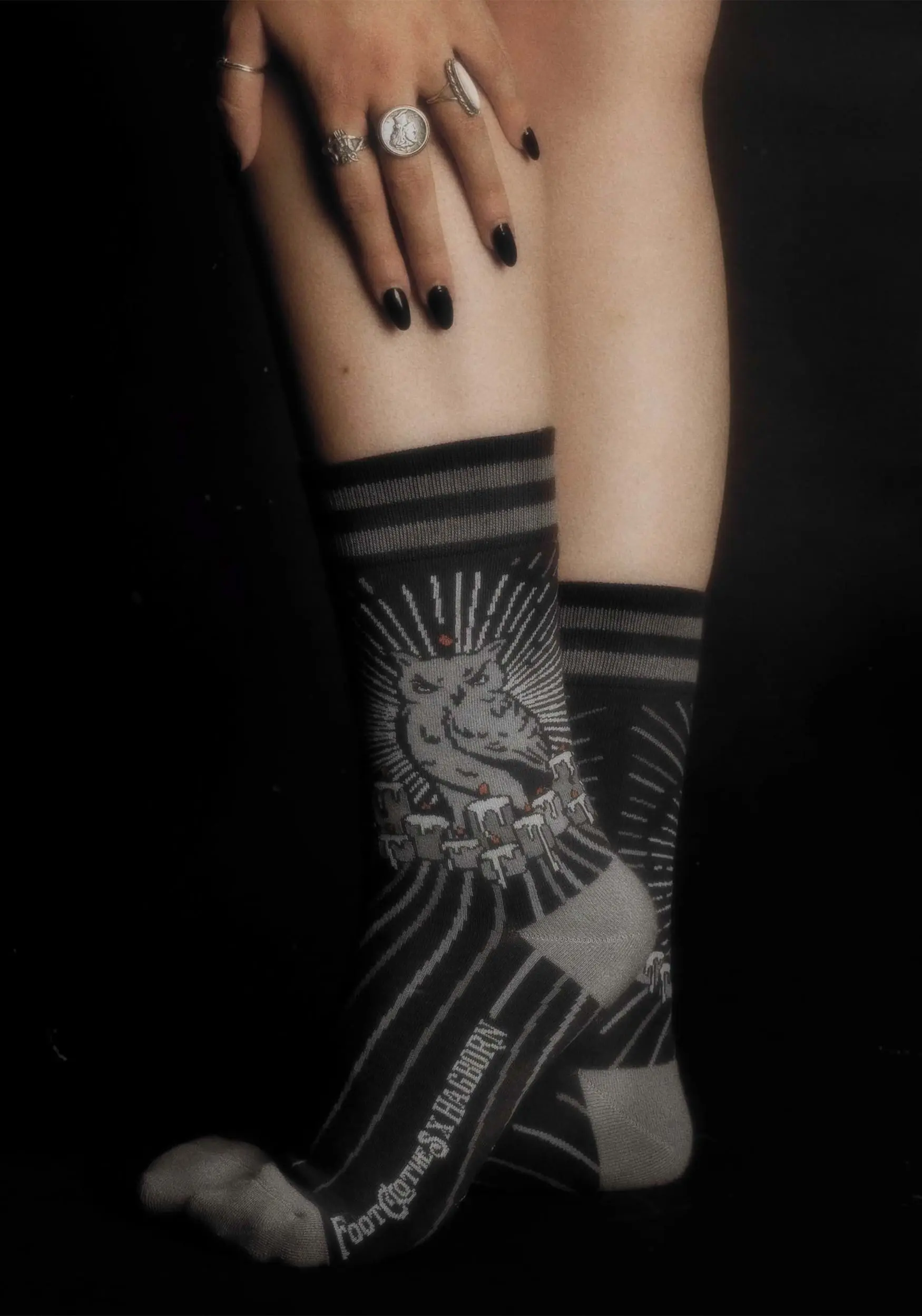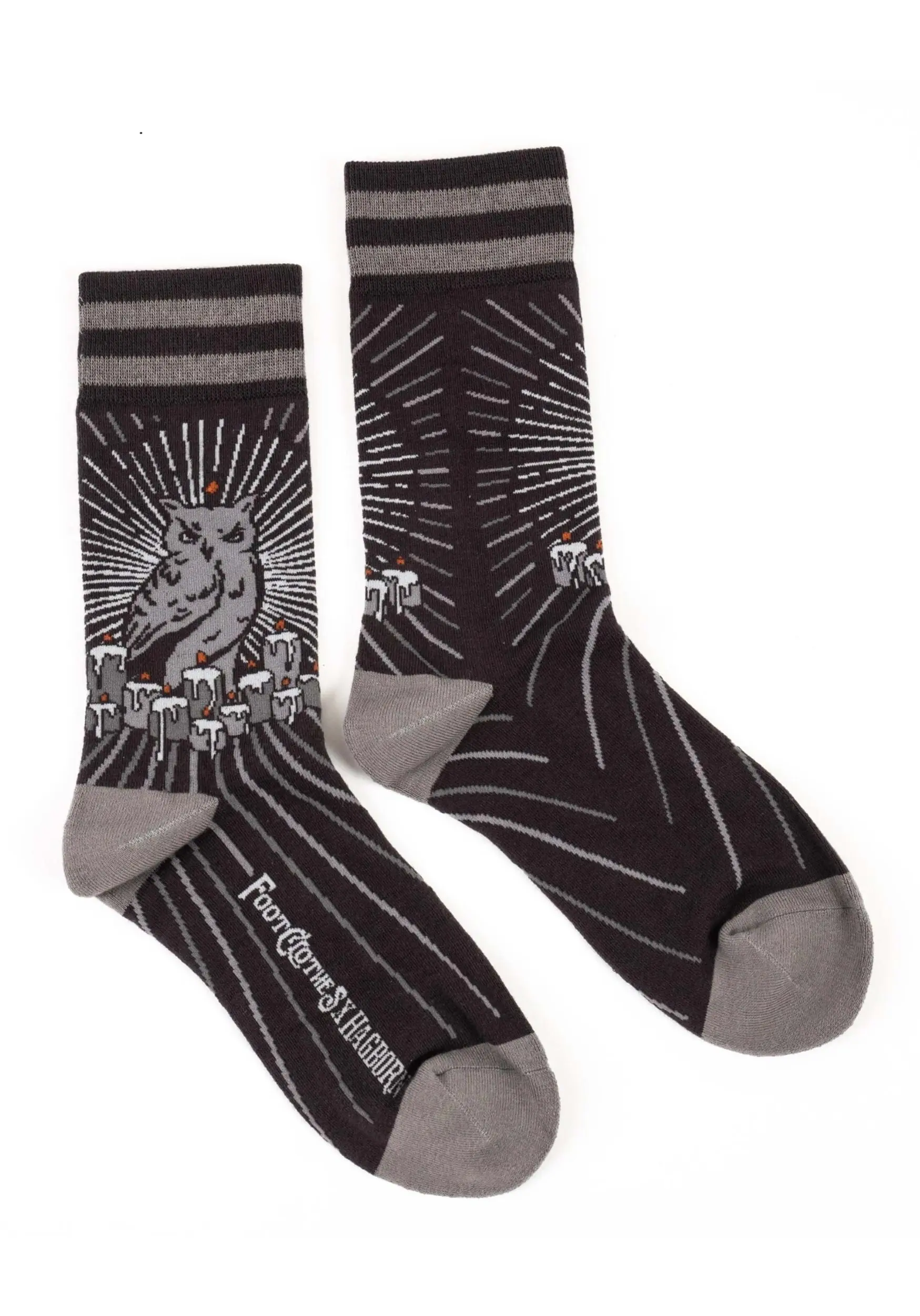 Cast a spell and feel a tingle of magic from your fingers to your toes when you slip on a pair of these Night Owl FootClothes x Hagborn Collab Socks. Capes are overrated–keep your wizard wear subtle and your spells a surprise with these classy and comfy socks. Sleek and classic black is accentuated with sharp silver aura lines that radiate from a spiritlike owl surrounded by melting candles. The heel and toe are made from a double layer of terry for comfort while standing over a cauldron or taking part in a wizard’s duel.