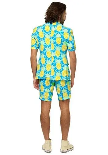 This colorful Shineapple suit is ready for a day of sun and fun! The pineapple pattern over a poolside blue background covers a short-sleeved blazer, shorts, and a matching tie. Just add your own short-sleeved colored shirt and you’ll be ready to roll. The fully lined jacket has two buttons in front, five pockets, and padded shoulders for a dressy fit. A regular fit, this jacket fits those who are 5’8 to 5’11 best. The flat front shorts have a zipper fly and button-loop closure. You can choose to machine wash or dry clean this suit, either way, you’ll show up fresh and cool to your next summer event!