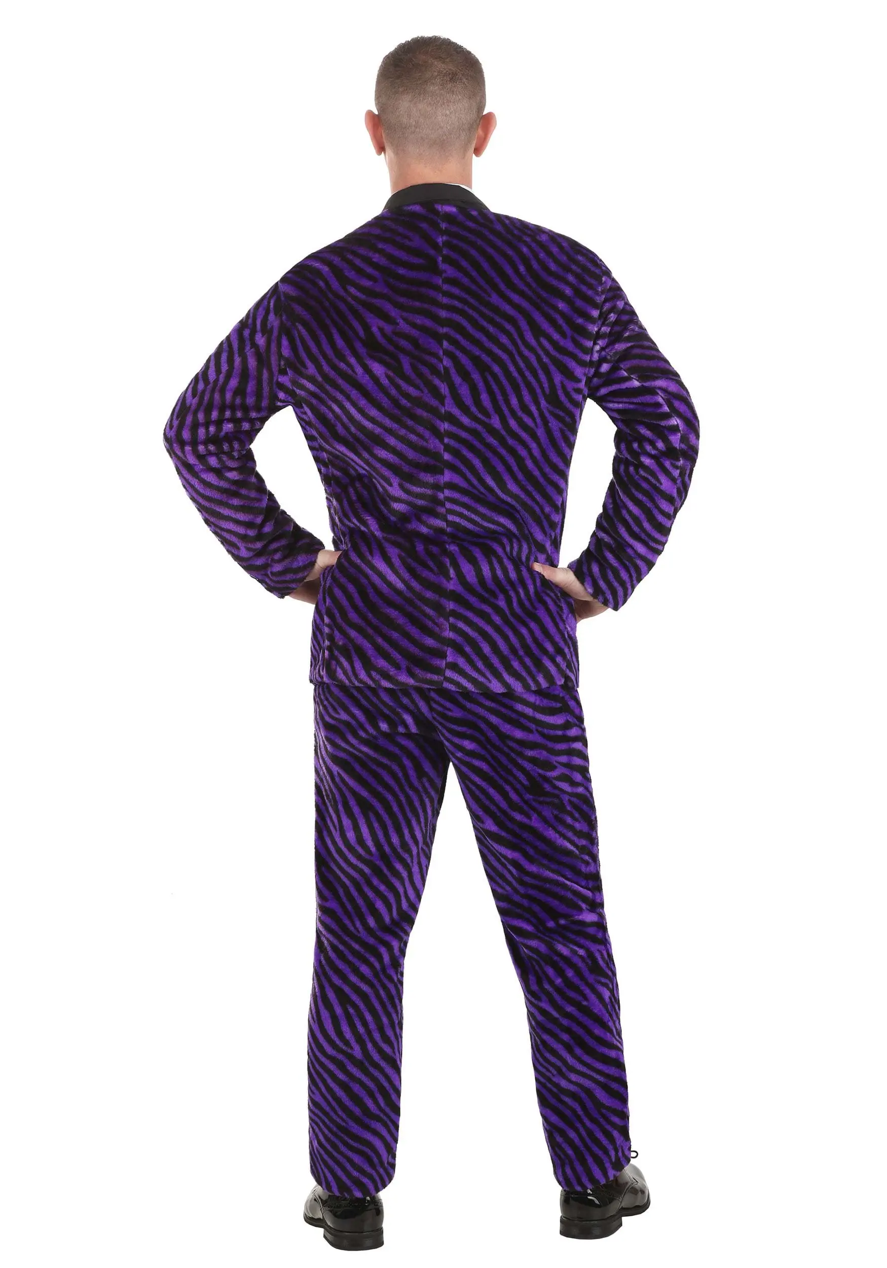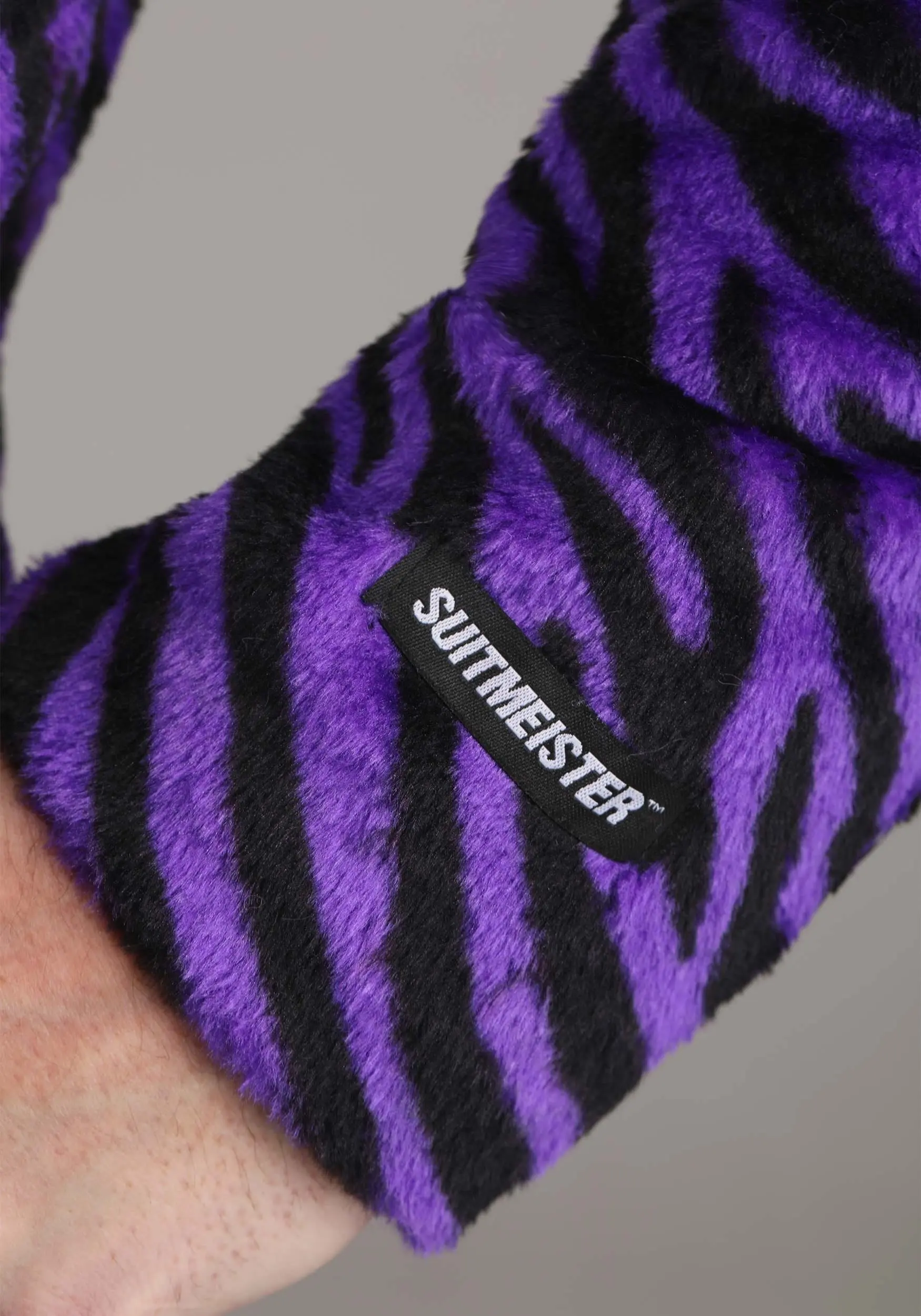 Everyone will think you’re rolling in dough when you wear a suit as outrageous as this Purple Faux Fur Pimp Suit Suitmeister! The two-piece suit set features a purple jacket made of luxurious faux fur and striped with black tiger print. Black poplin lapels and gold satin lining truly make a statement – and that statement is, “I light my scented candles with hundred-dollar bills.” The matching pants are the perfect marriage of comfortable and crazy, thanks to a hidden elastic band in the sides of the waistband that let you adjust them to your size. The matching black tie is printed with a gold dollar sign, in case some onlookers don’t get the message right away.Â