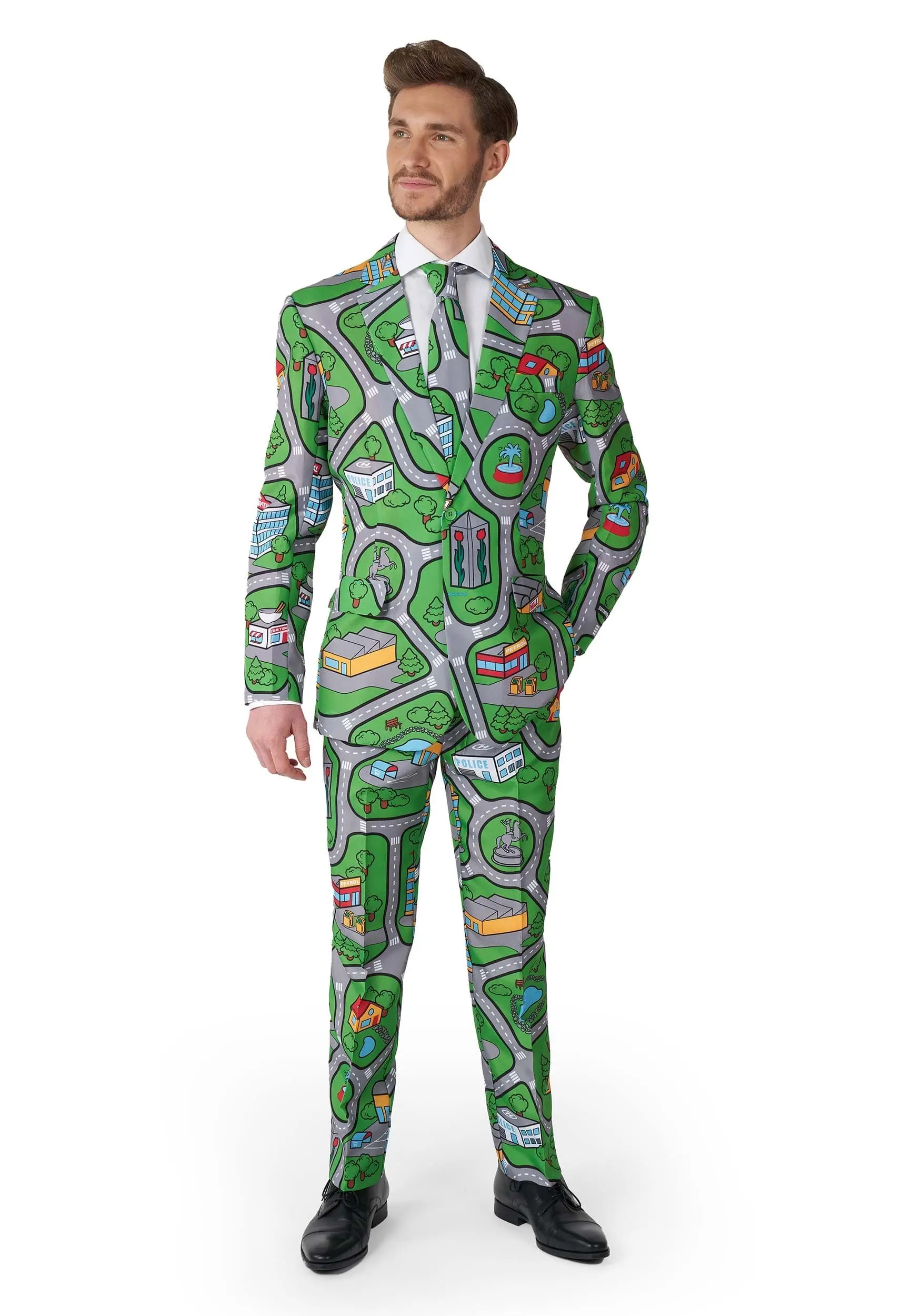 Well, if any of that sounds like you, then this Suitmeister Carpet City Green suit is the perfect way to rep your favorite toy from your youth. You will feel like a big boy when you slip into this fetching green suit. The jacket, slacks, and tie all have that world-renowned pattern that is somehow familiar to every person on the planet.