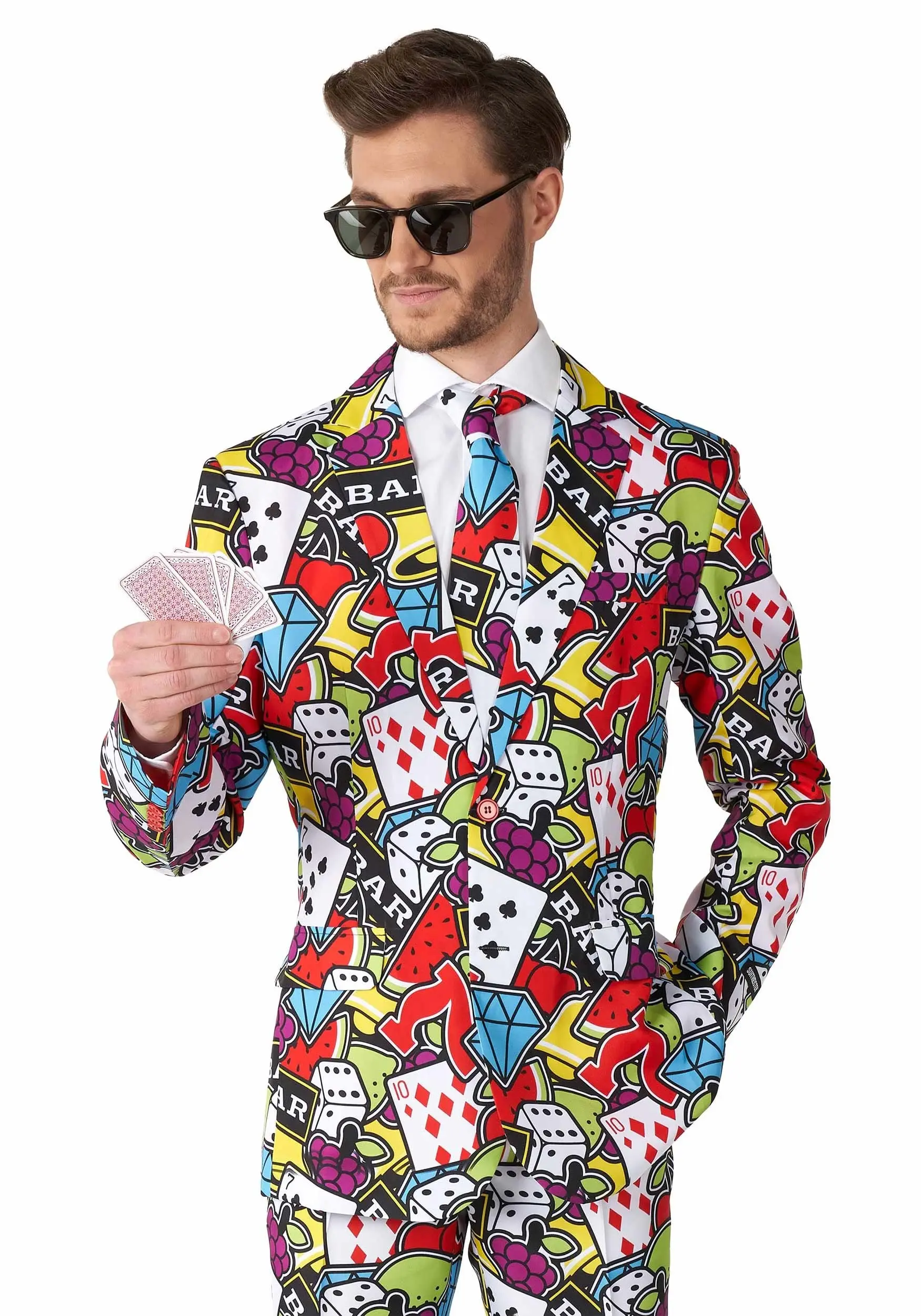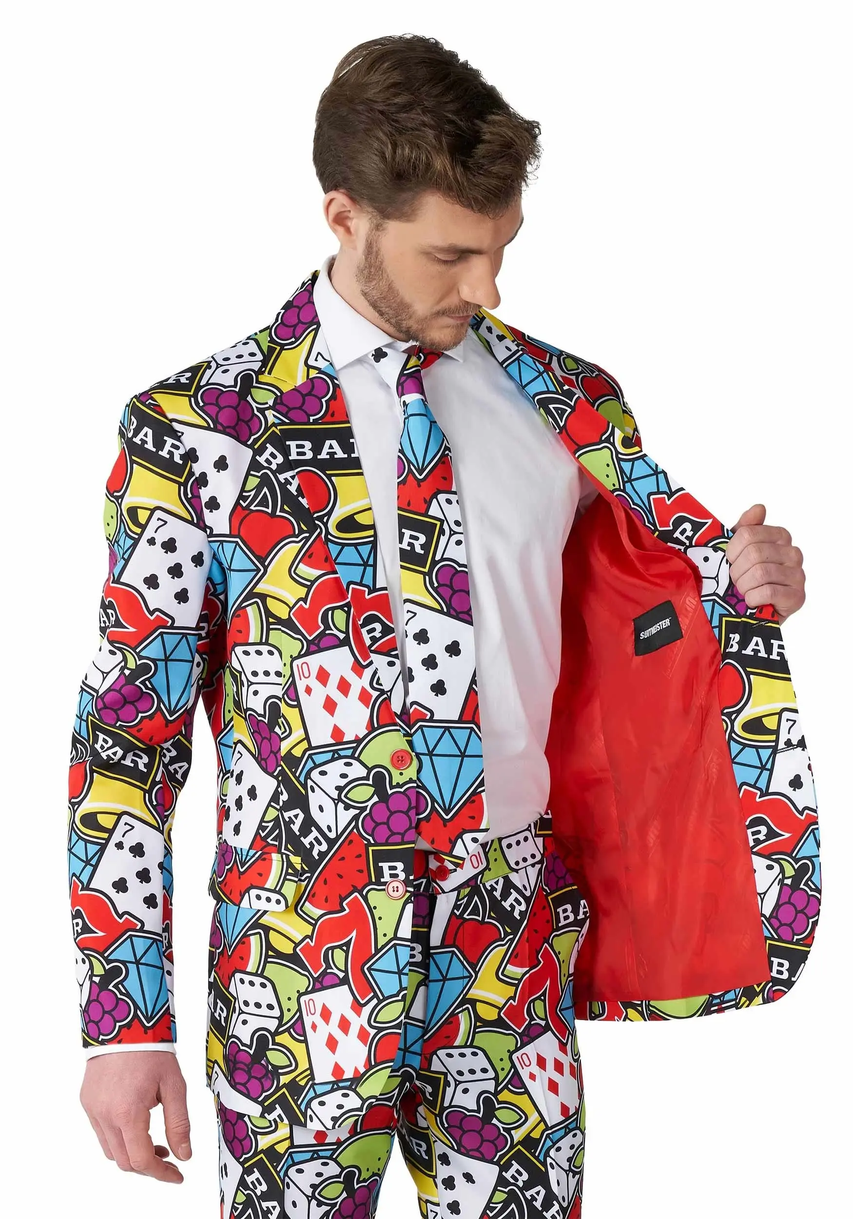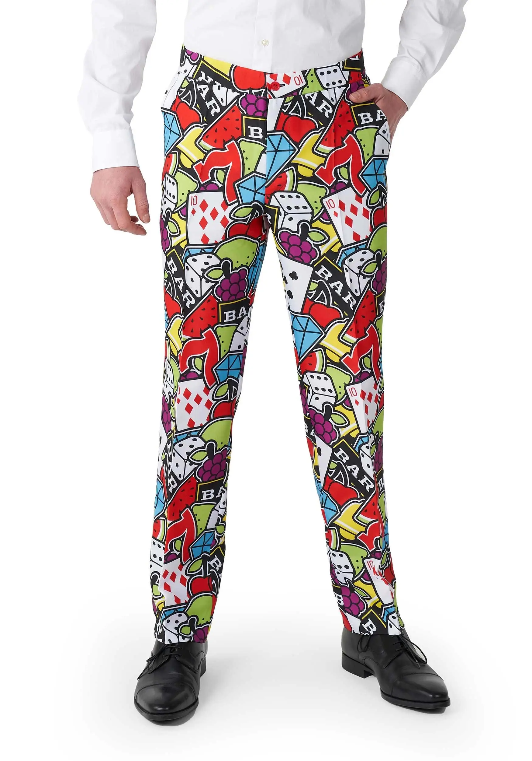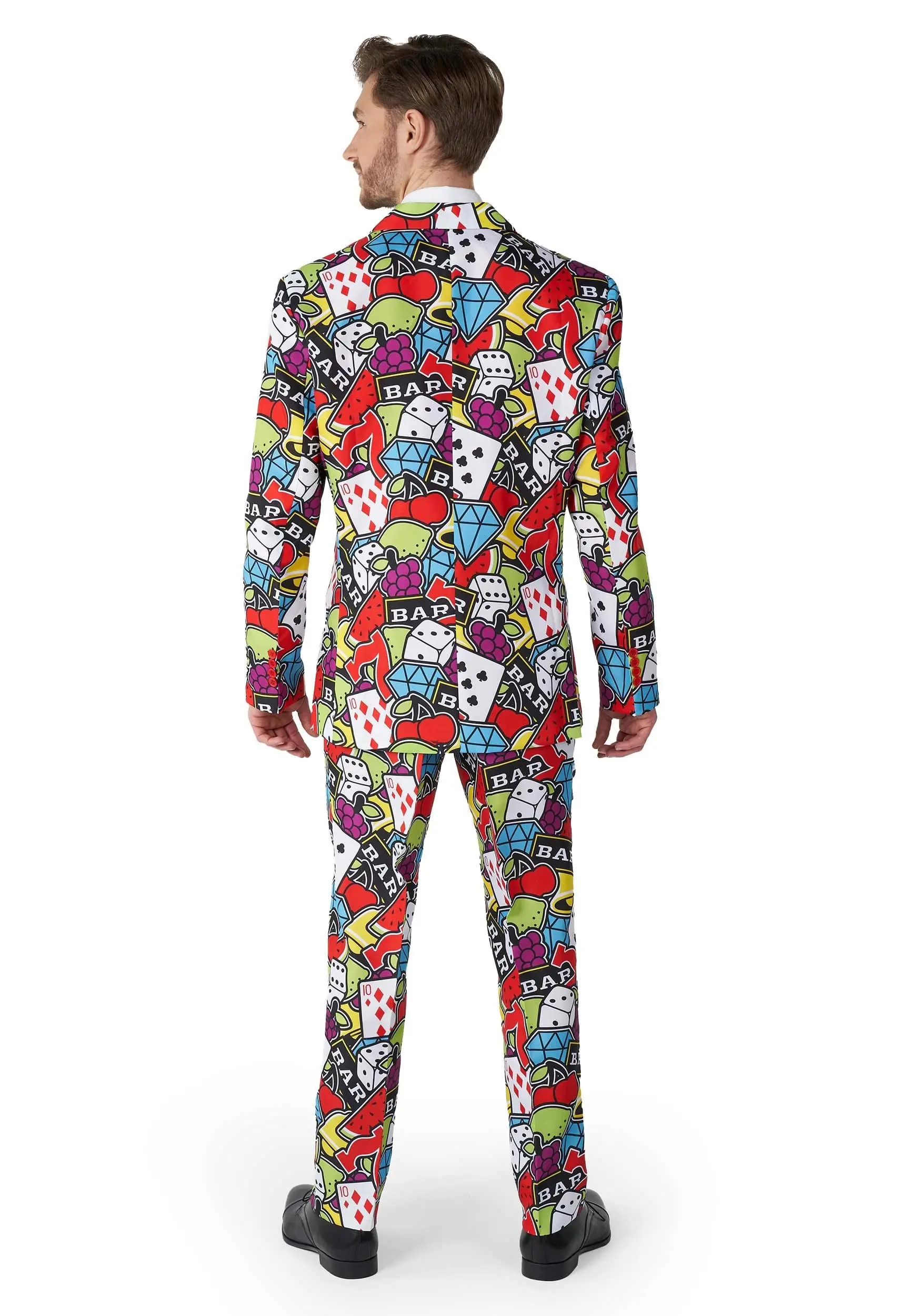 It’s not fair, but maybe we can help! This dapper suit is covered in casino icons, from cards to those iconic sevens. Wearing this Casino Icon suit, every time you look in the mirror, you will find yourself finally happy with where your life is at. You will feel like an actual slot machine, card table, or casino cosplayer. You will feel like a winner, and isn’t that what casino styled clothing is all about?