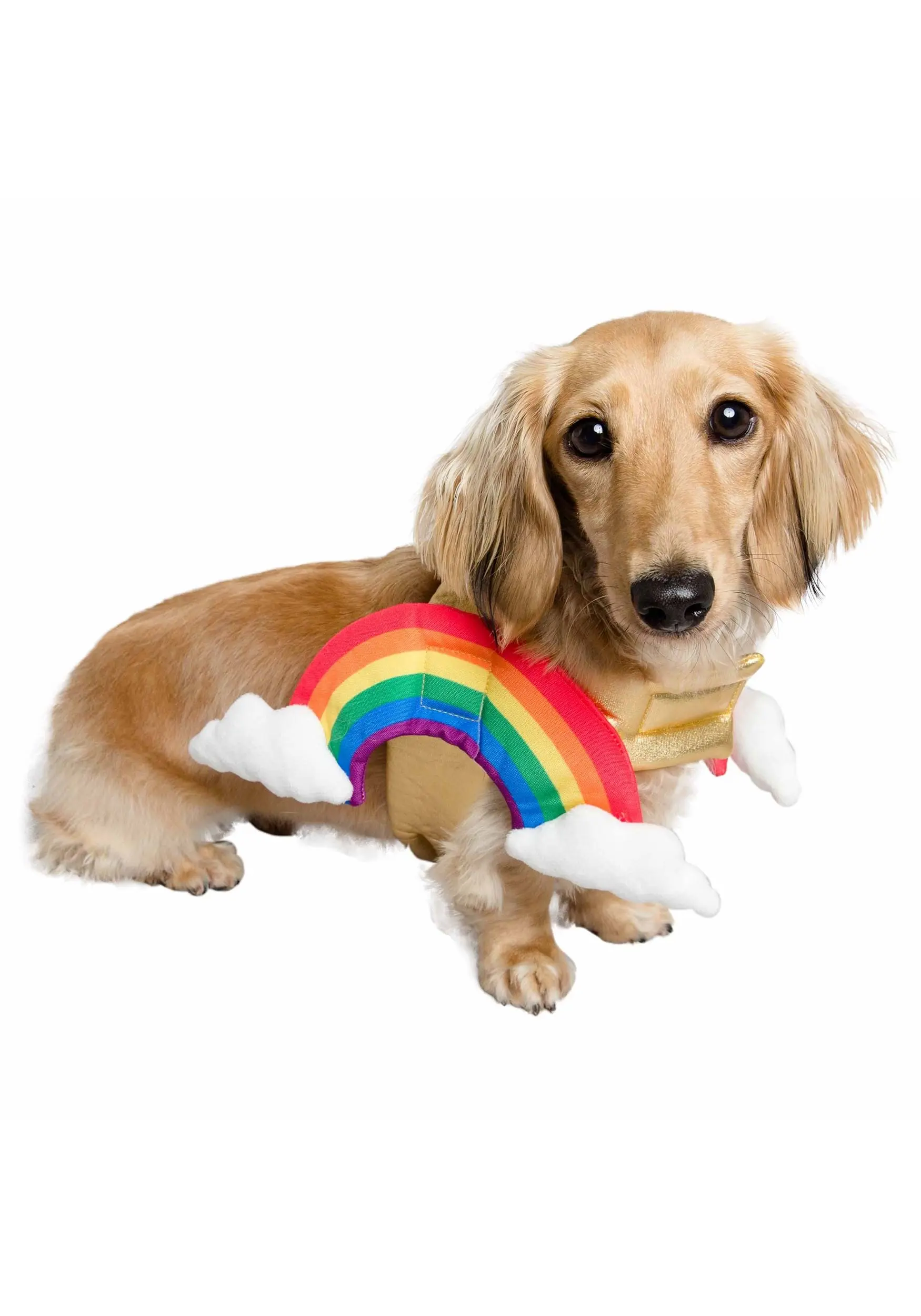 Deck the furry ray of sunshine in your life in a Rainbow Costume for Pets! The sweet outfit comes in different sizes to fit small, medium, and large animals. It features a multi-hued fabric rainbow shaped like an upside-down U, edged on both ends with puffy white fabric clouds. It’s attached to two sets of gold fabric straps with Velcro sewn to their ends. One fastens around your pet’s midsection, while the other adds security and stability by fastening around the chest.