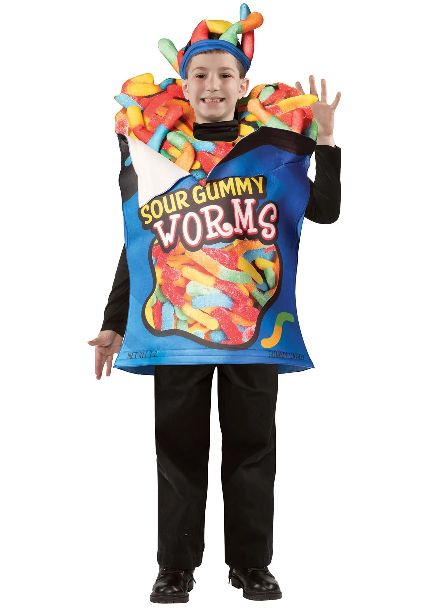 Look deliciously awesome when wearing your Sour Gummy Worm Costume for Kids! The rectangular blue tunic has roomy arm and neck holes so that you can wear it over your choice of lightweight outfit, and is stiffened with foam to help it keep its shape. The top has printed graphics that look like an opened bag, and the printed material around the neck hole looks like a tangled bunch of sour gummy candies. The front has more gummy worm graphics and the words “Sour Gummy Worms” in yellow, white, and red lettering.Â