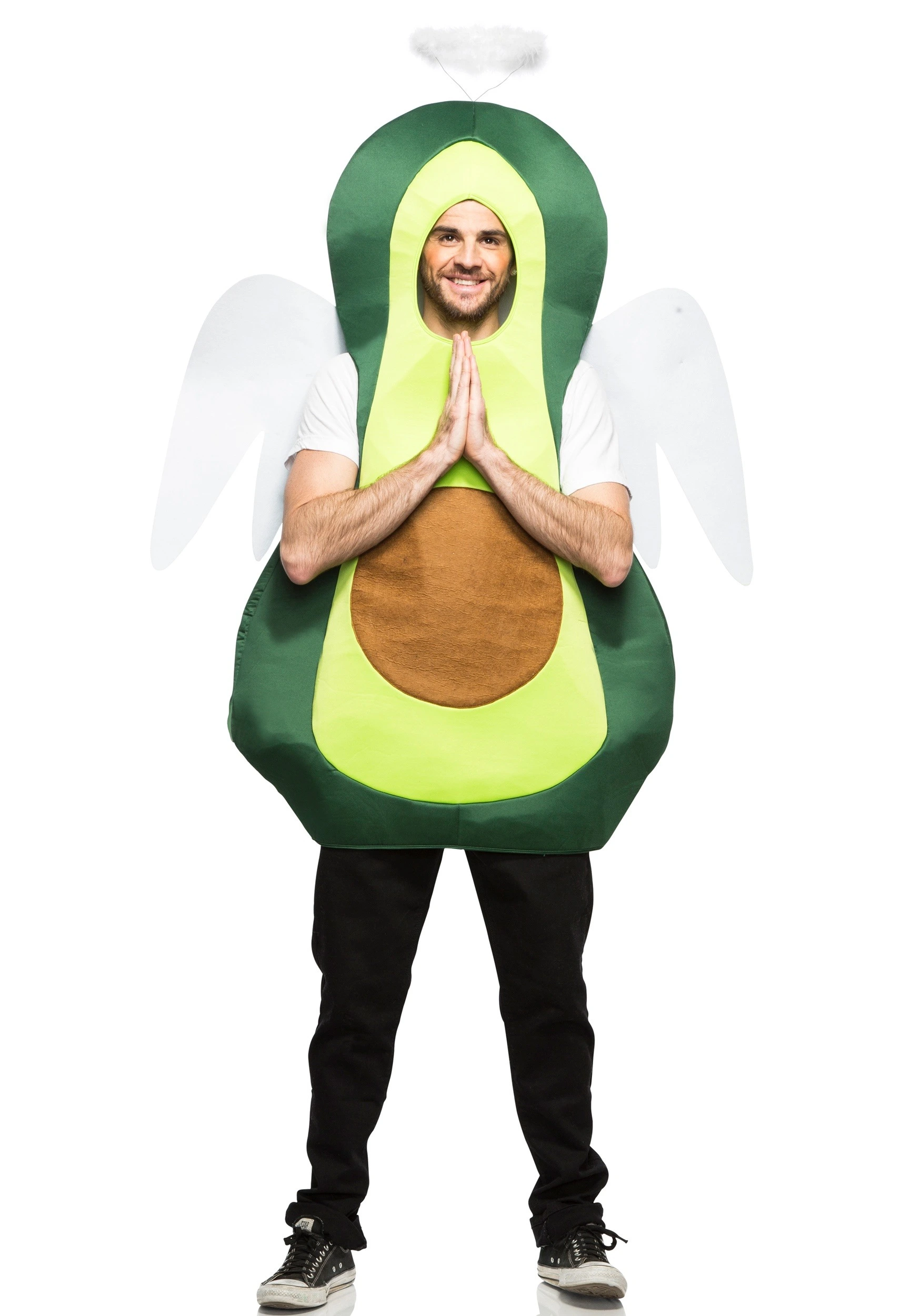 This costume is as easy to wear as it is clever! It’s a tunic that’s made to look like a freshly-sliced avocado half. It is almost an exact replica of the real thing, with two major exceptions: 1) our avocado probably costs as much as two real avocados at the store, but lasts a lot longer (just kidding! But seriously, avocados are so expensive!) and 2) our avocado is not going to get overripe within the span of minutes like a real avocado, which can go from hard-as-a-rock to mush in what seems like a day. The best part? Sweet white wings attached to the back of this costume make your ‘mole holy!Â