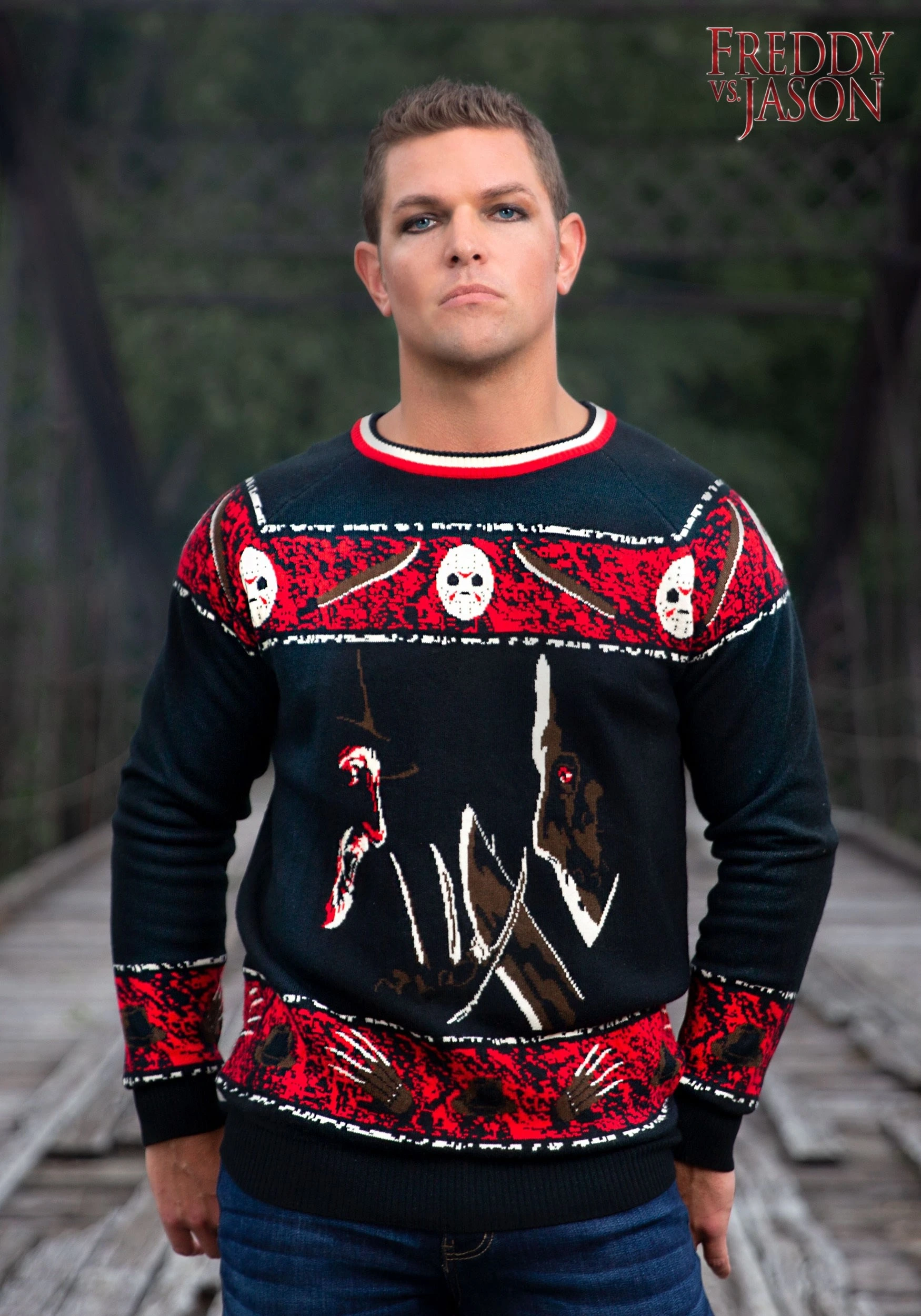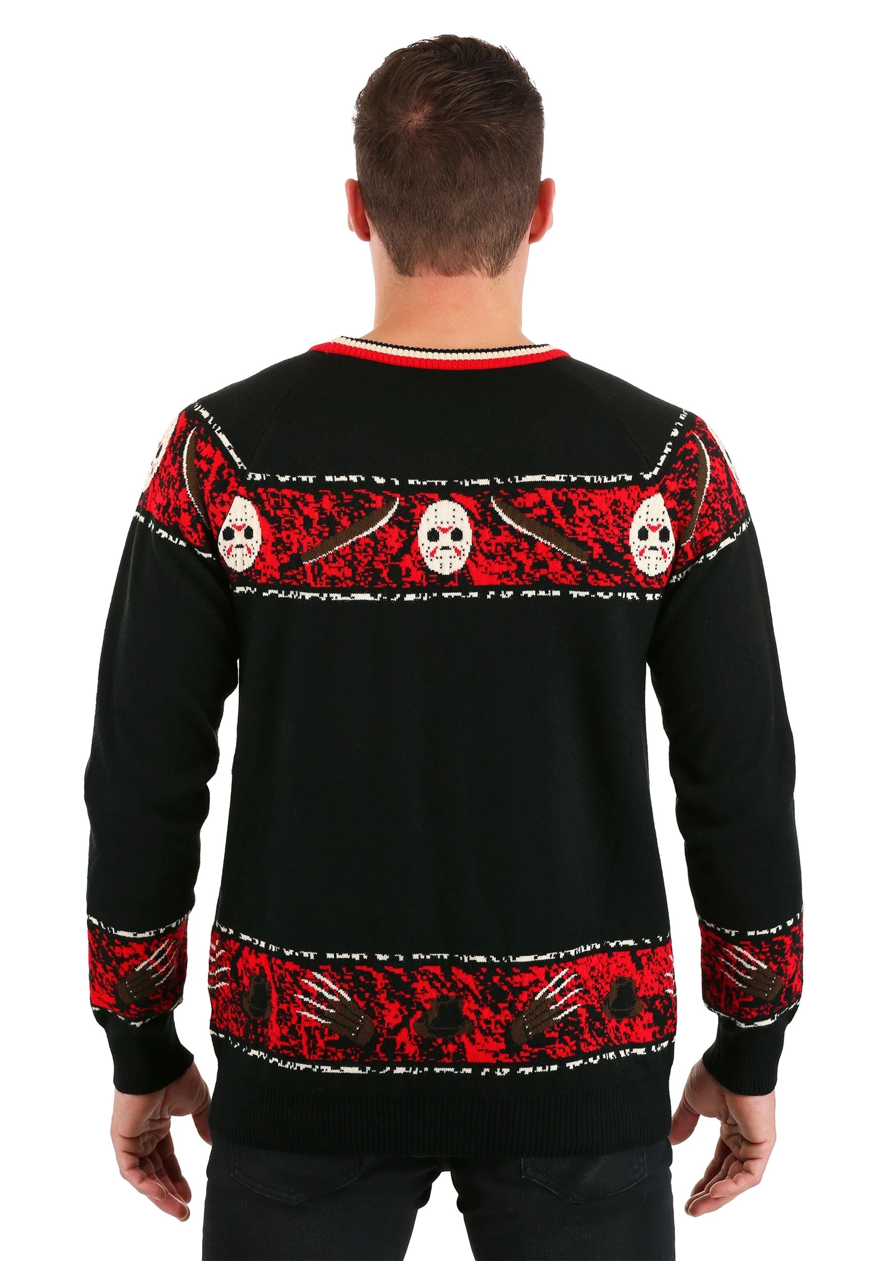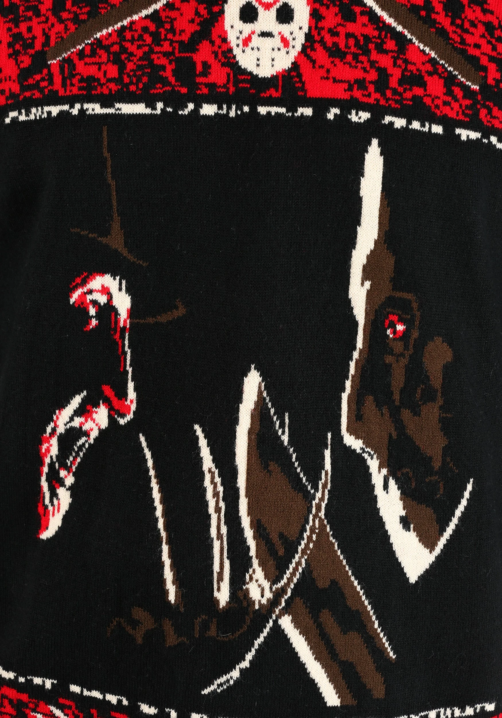 This officially licensed Freddy vs Jason Halloween Sweater brings you double the dread by combining Freddy Krueger and Jason Voorhees onto a single sweater. It’s part of our line of scary-themed sweaters that will have you ready for Halloween. The sweater is made out of a heavy acrylic material and comes with a knit-in design on the exterior. Both Freddy and Jason are on the front and they look ready to rumble. It also features a bright red banner on the top and bottom to help add a gory feel to the sweater. Whether you want to give your Halloween wardrobe a much needed fear-infused update, or you want to skip the costume at Halloween this year, this sweater is the perfect solution!