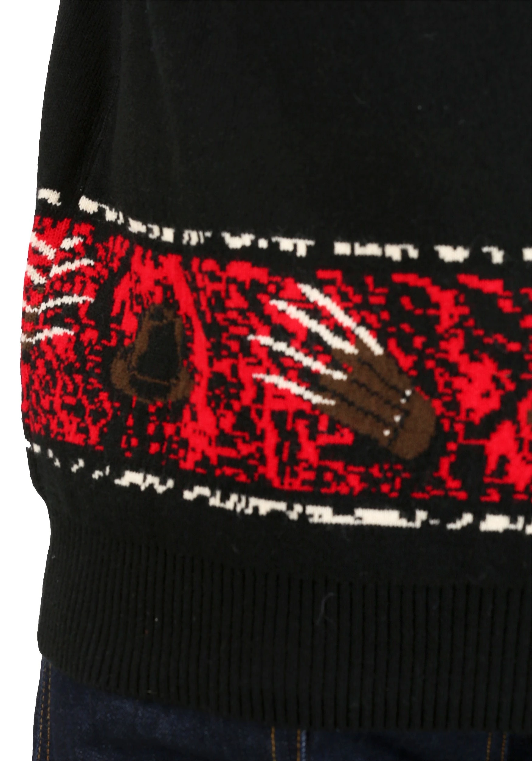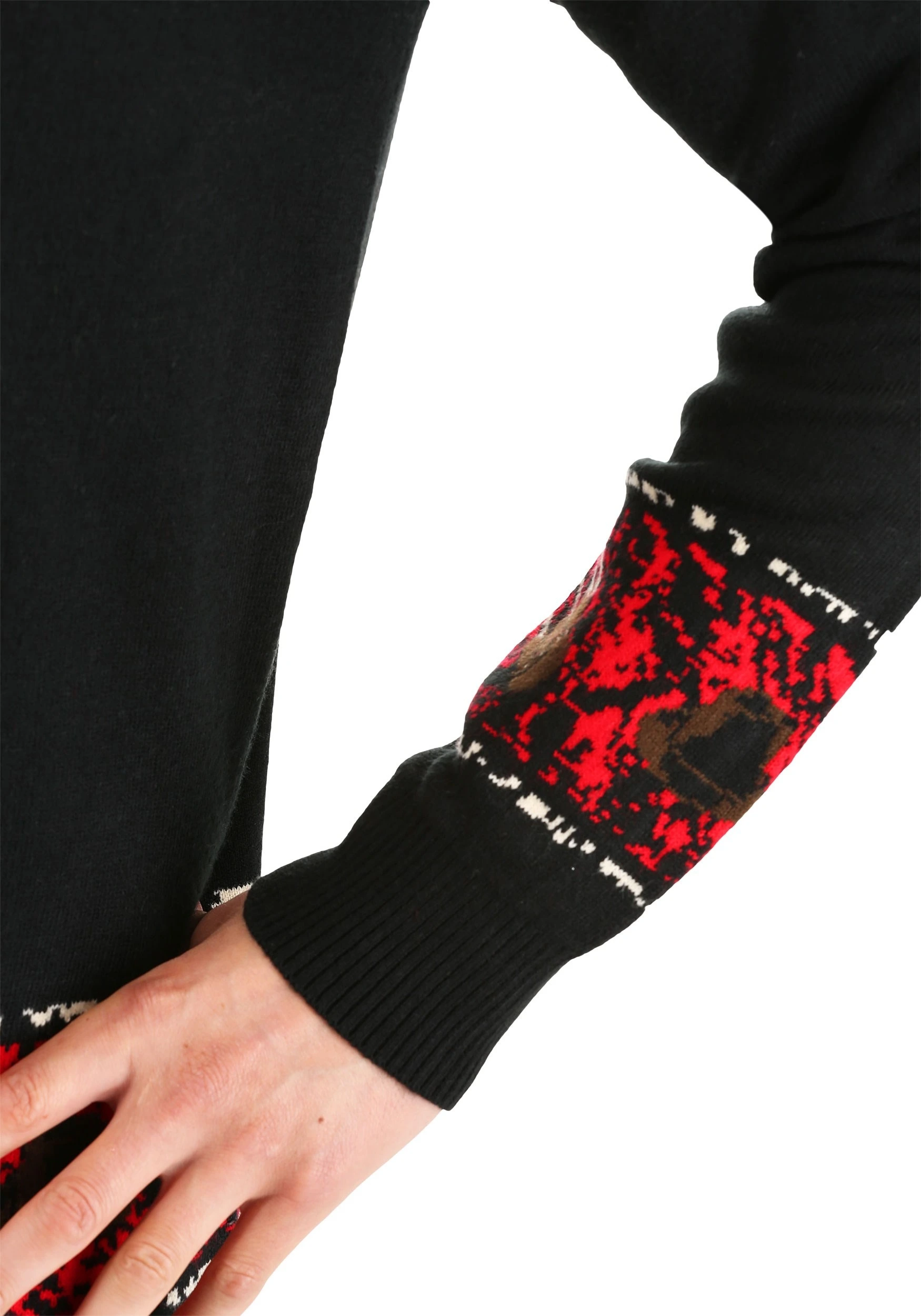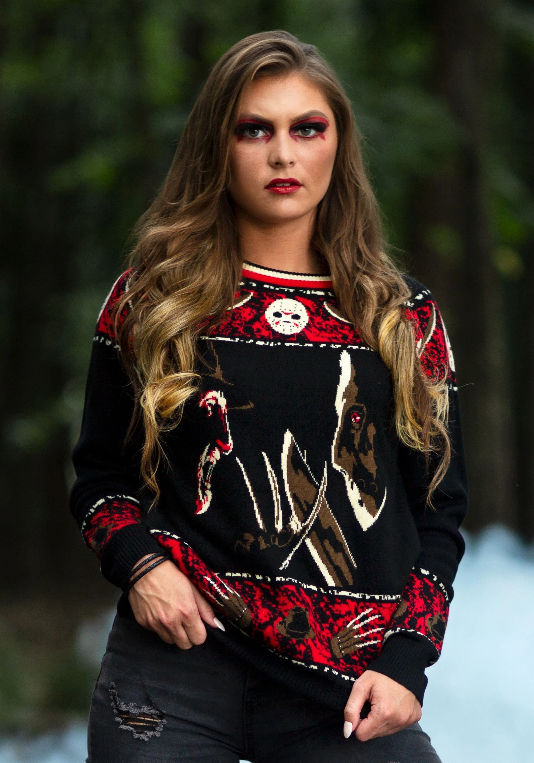 This officially licensed Freddy vs Jason Halloween Sweater brings you double the dread by combining Freddy Krueger and Jason Voorhees onto a single sweater. It’s part of our line of scary-themed sweaters that will have you ready for Halloween. The sweater is made out of a heavy acrylic material and comes with a knit-in design on the exterior. Both Freddy and Jason are on the front and they look ready to rumble. It also features a bright red banner on the top and bottom to help add a gory feel to the sweater. Whether you want to give your Halloween wardrobe a much needed fear-infused update, or you want to skip the costume at Halloween this year, this sweater is the perfect solution!