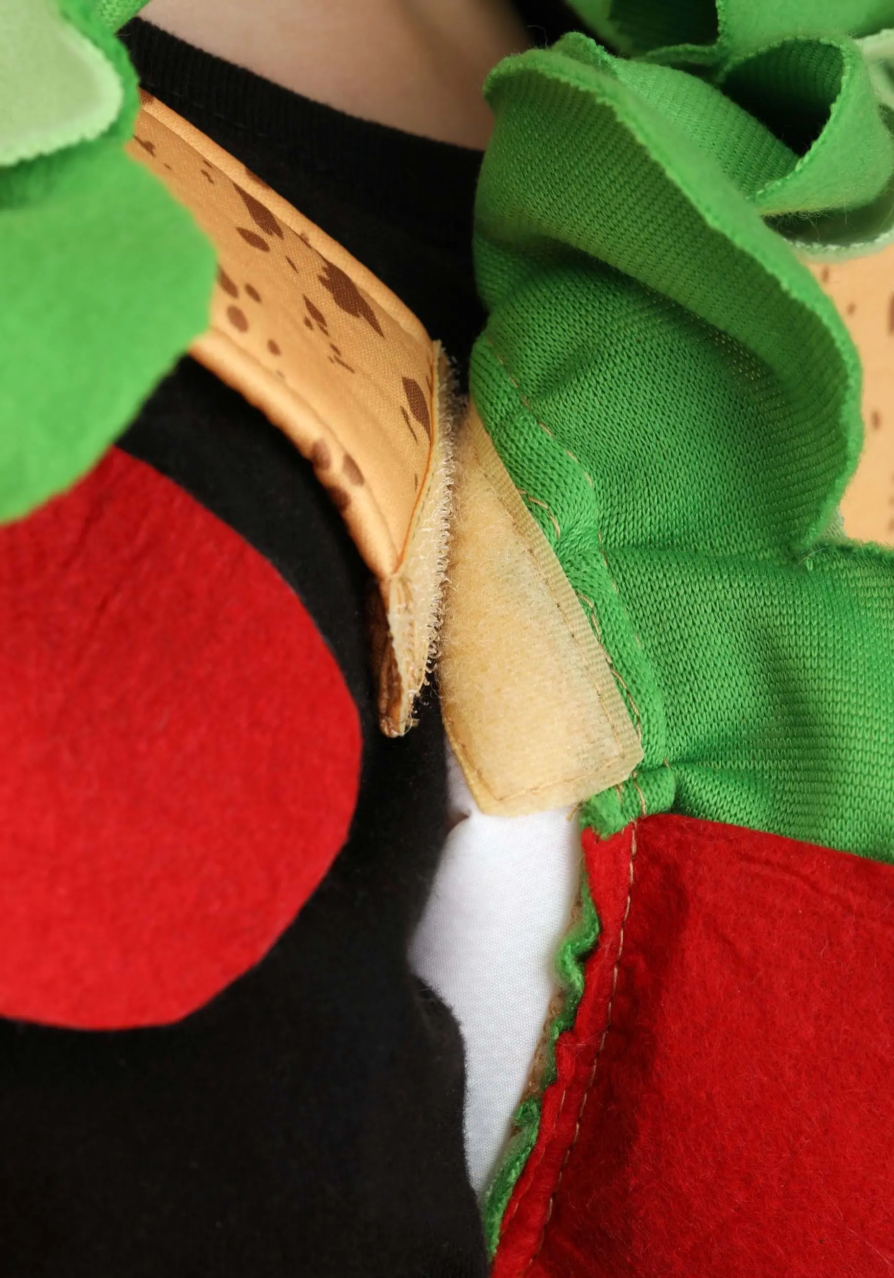 The outside of the tunic features a realistic taco shell print, while several “ingredients” adorn the edges. Red, orange, brown, and green felt help give the tunic appear to be stuffed with tomato, cheese, meat, and lettuce. When your kiddo wears this fun costume, they’ll certainly resemble their favorite food, but we can’t guarantee that the tunic tastes as good as it looks!